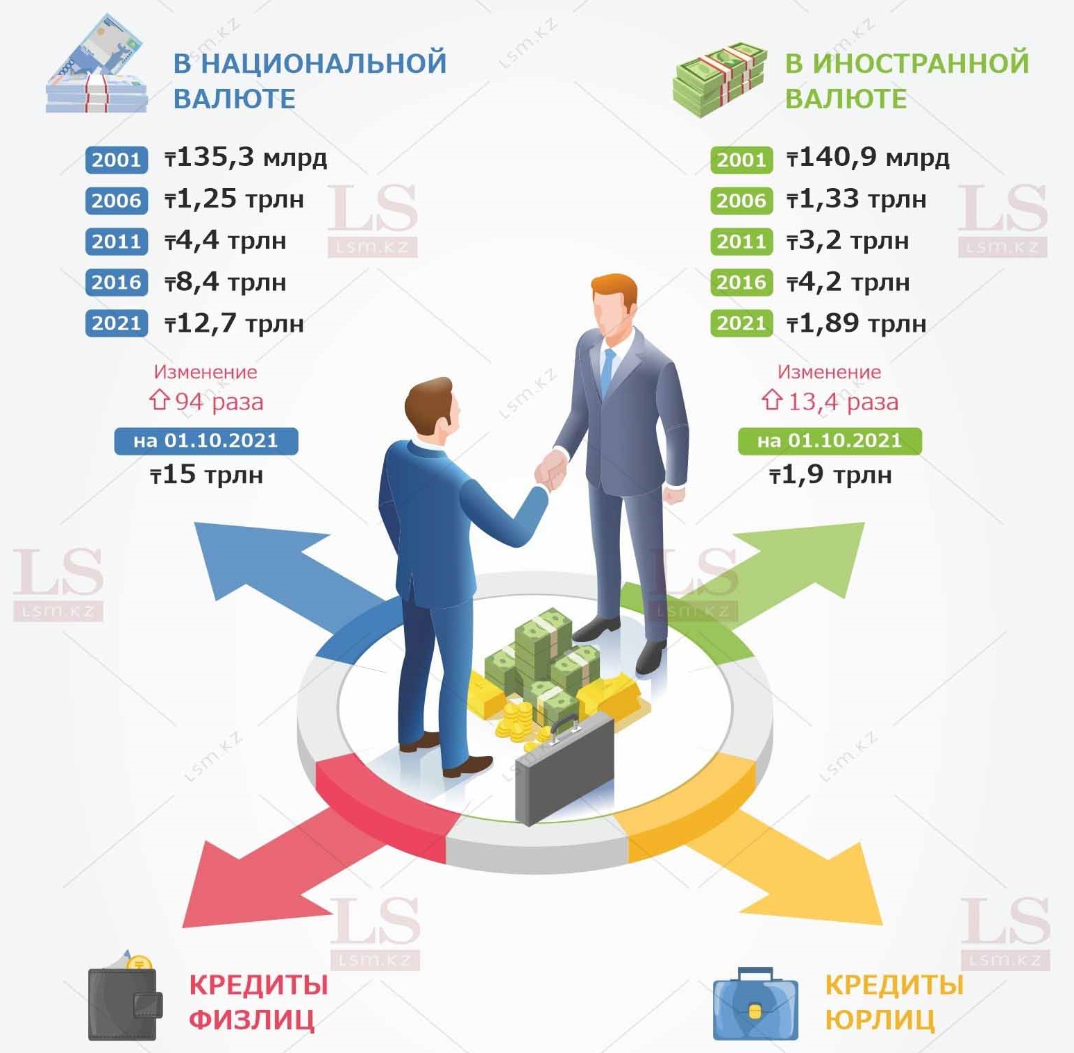 По данным Нацбанка, на 1 января 2001 года в банках в общем числились займы на 276,2 млрд тенге. Через 20 лет (1 января 2021 года) объемы выросли до 14,6 трлн тенге (+53 раза). А уже на 1 октября 2021 года достигли 16,9 трлн тенге. Таким образом, почти за 21 год кредитование выросло в 61,2 раза, или на 16,6 трлн тенге.
