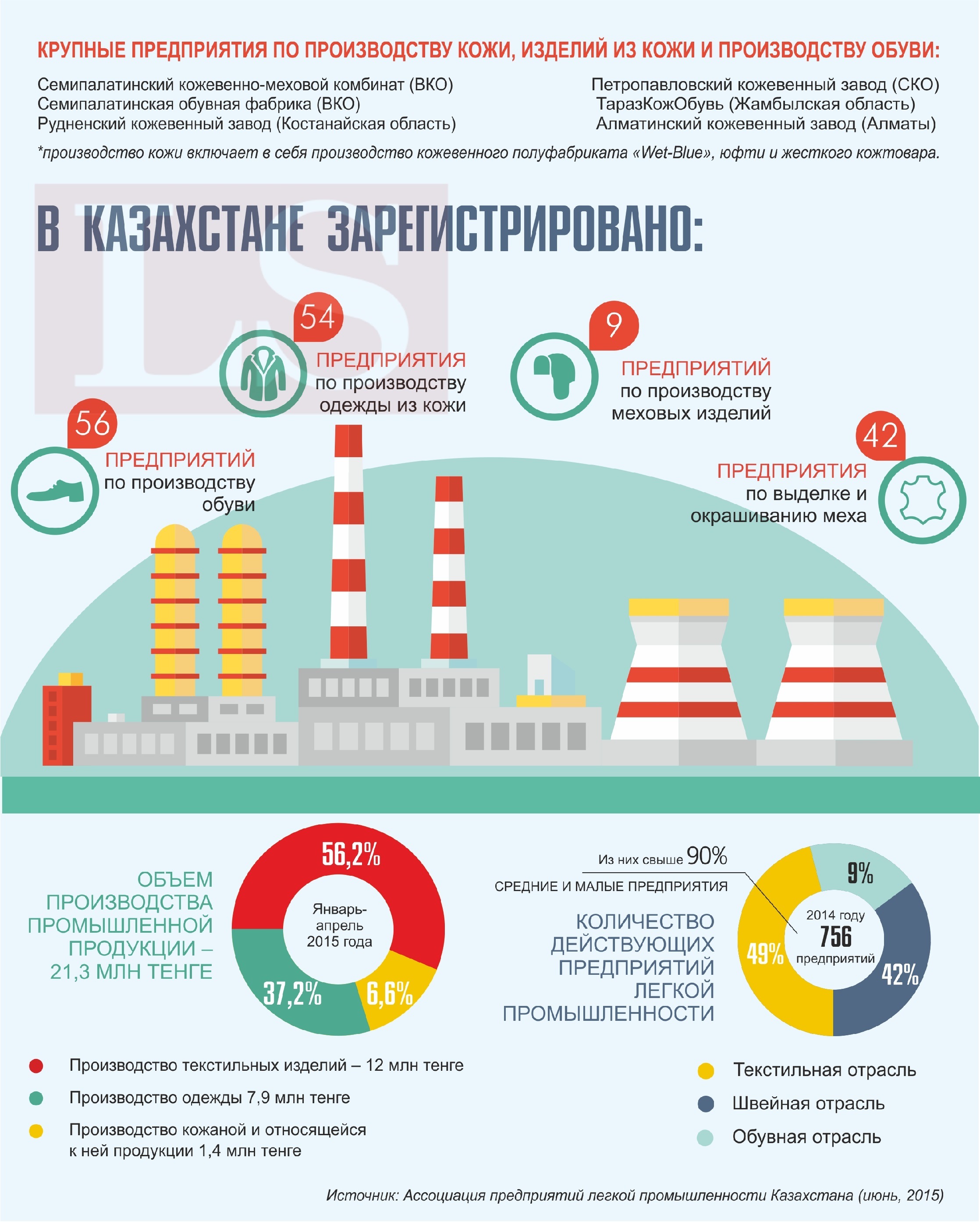 К крупным предприятиям по производству кожи, изделий из кожи и производству обуви в Казахстане относятся:
