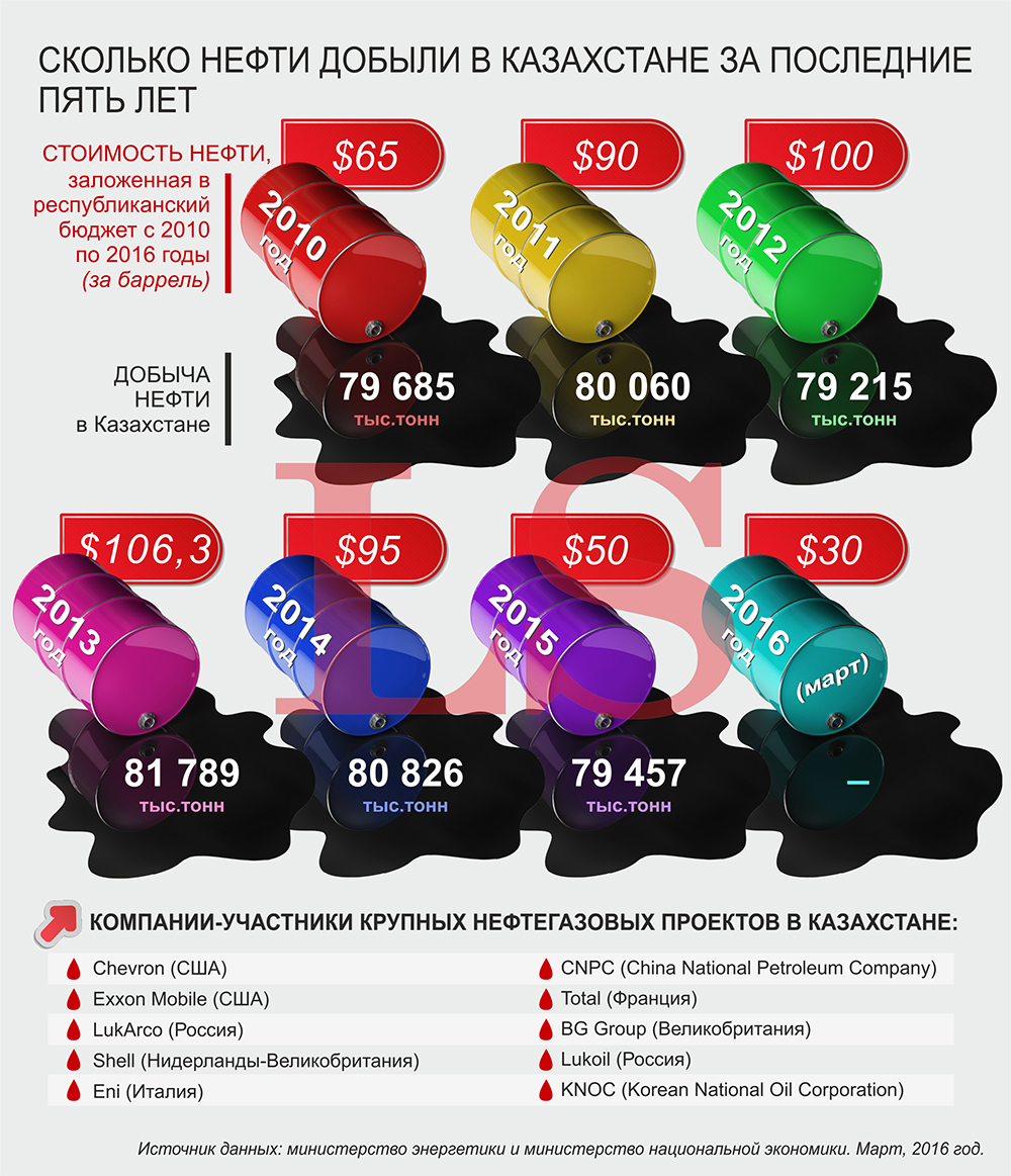 Отметим, в феврале 2016 года правительство Казахстана в очередной раз пересмотрело параметры республиканского бюджета. Так среднегодовая цена на нефть в бюджет была определена в размере $30 за баррель. В марте занимавший должность министра энергетики Владимир Школьник заявил, что добыча сырья в Казахстане может быть увеличена до 77 млн тонн, если средняя стоимость черного золота вырастет до $40 за баррель.