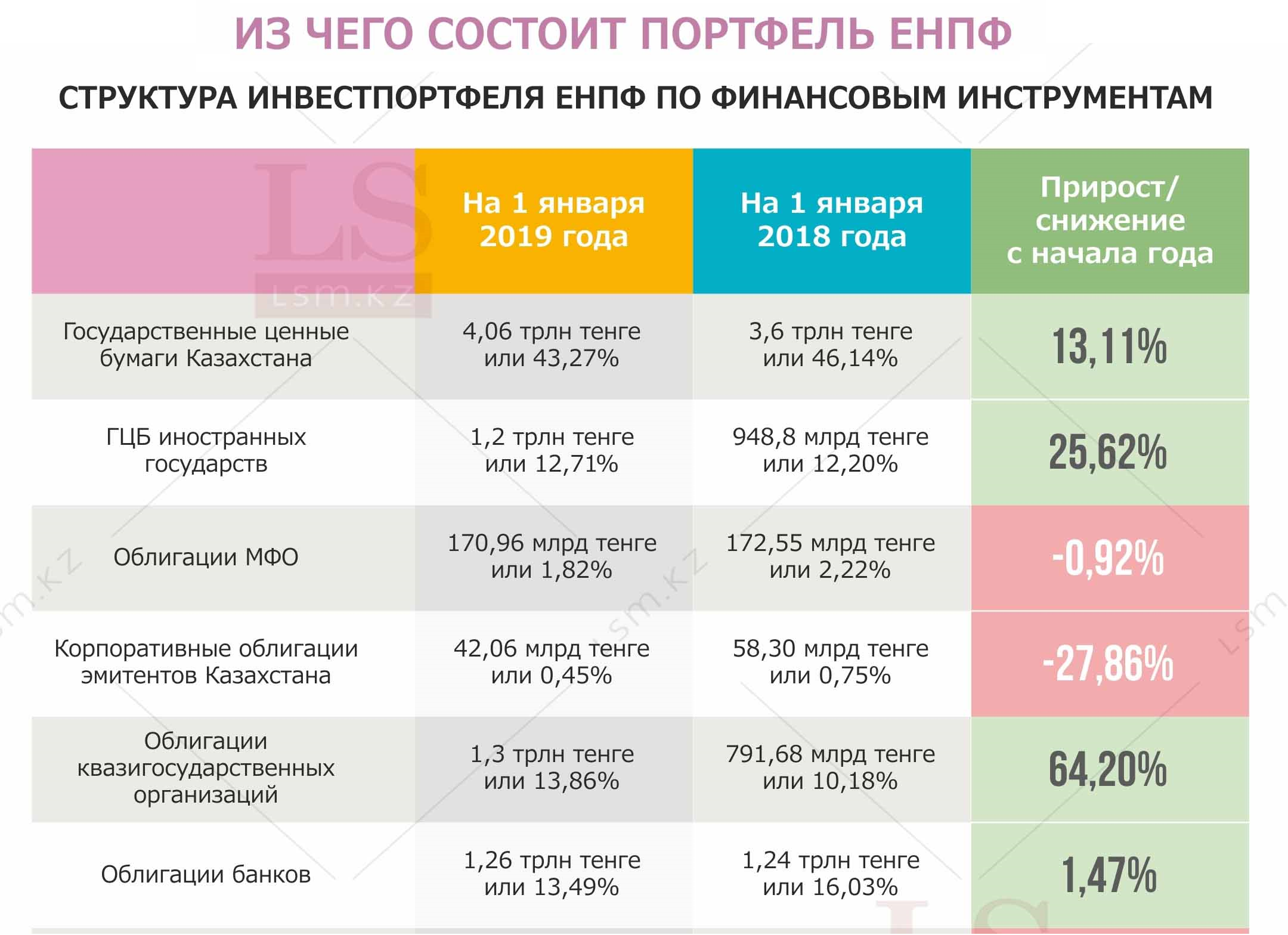 Согласно данным ЕНПФ, накопления казахстанцев на 1 января 2019 года достигли 9,5 трлн тенге, которые были распределены следующим образом: