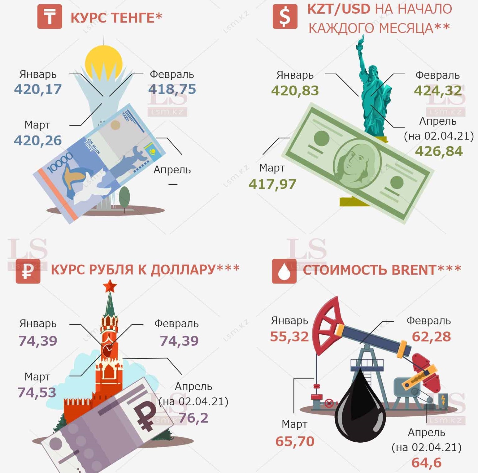 Вместе с тем средний курс тенге в январе составлял 420,1 за $1, в феврале снизился до 418,7 за $1 и в марте превысил 420,2 за $1. В то же время динамика рубля по отношению к американской валюте оказалась незначительной. В первые два месяца средний курс составлял 74,39 за $1, а в марте ослаб до 74,53 за $1. А вот нефть Brent колебалась в первые три месяца этого года с $55 до почти $66.