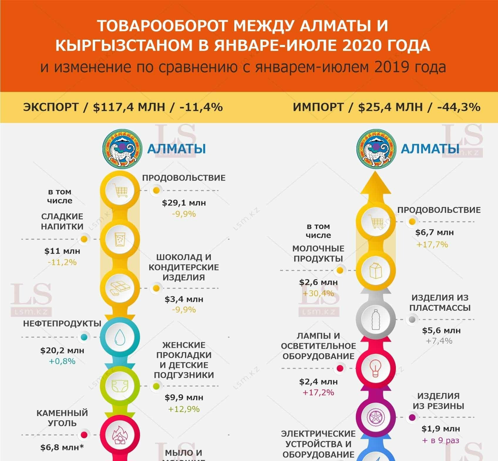 За семь месяцев 2020 года Алматы экспортировал в Кыргызстан товары на $117,4 млн, что на 11,4% меньше, чем в аналогичном периоде 2019 года. В соседнюю страну поставили сладкие напитки, нефтепродукты, женские прокладки, детские подгузники, каменный уголь, авто, парфюмерию, косметику и т.д.