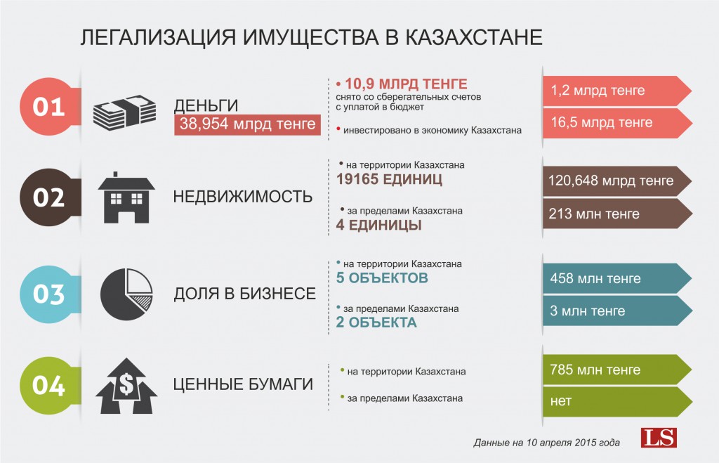 Из них на территории Казахстана легализовано имущества на 130 млрд тенге, за пределами республики - 216 млн тенге, денег - 59,3 млрд тенге, также сбор за легализацию - 2,4 млрд тенге. В частности, он озадачен низкими темпами легализации имущества, находящегося за рубежом. При этом Е.Сагнаев заметил, что на 23 апреля легализовано всего 8 объектов.