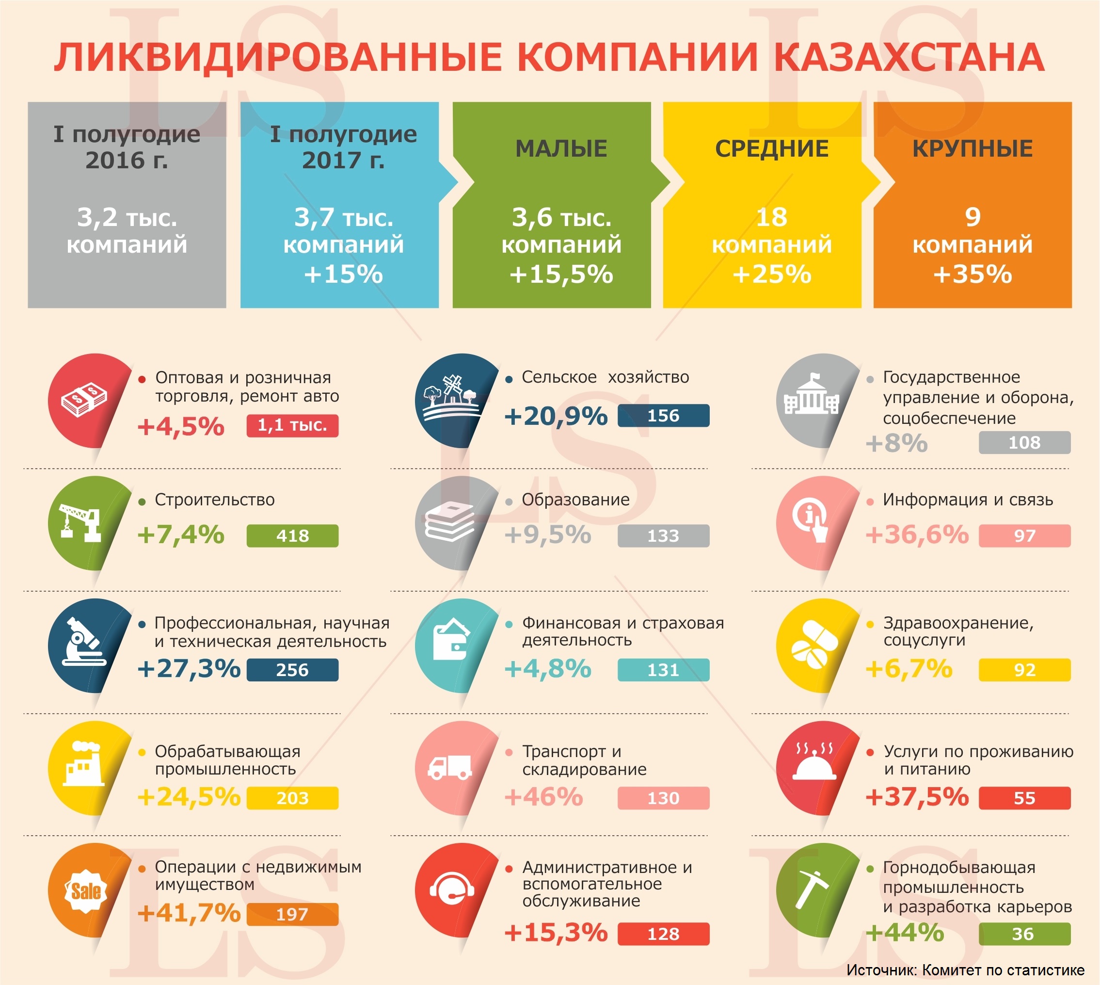 За шесть месяцев было ликвидировано 3,6 тыс. малых предприятий (рост на 15,5%), 18 средних (рост на 25%), 9 крупных (рост на 35%).