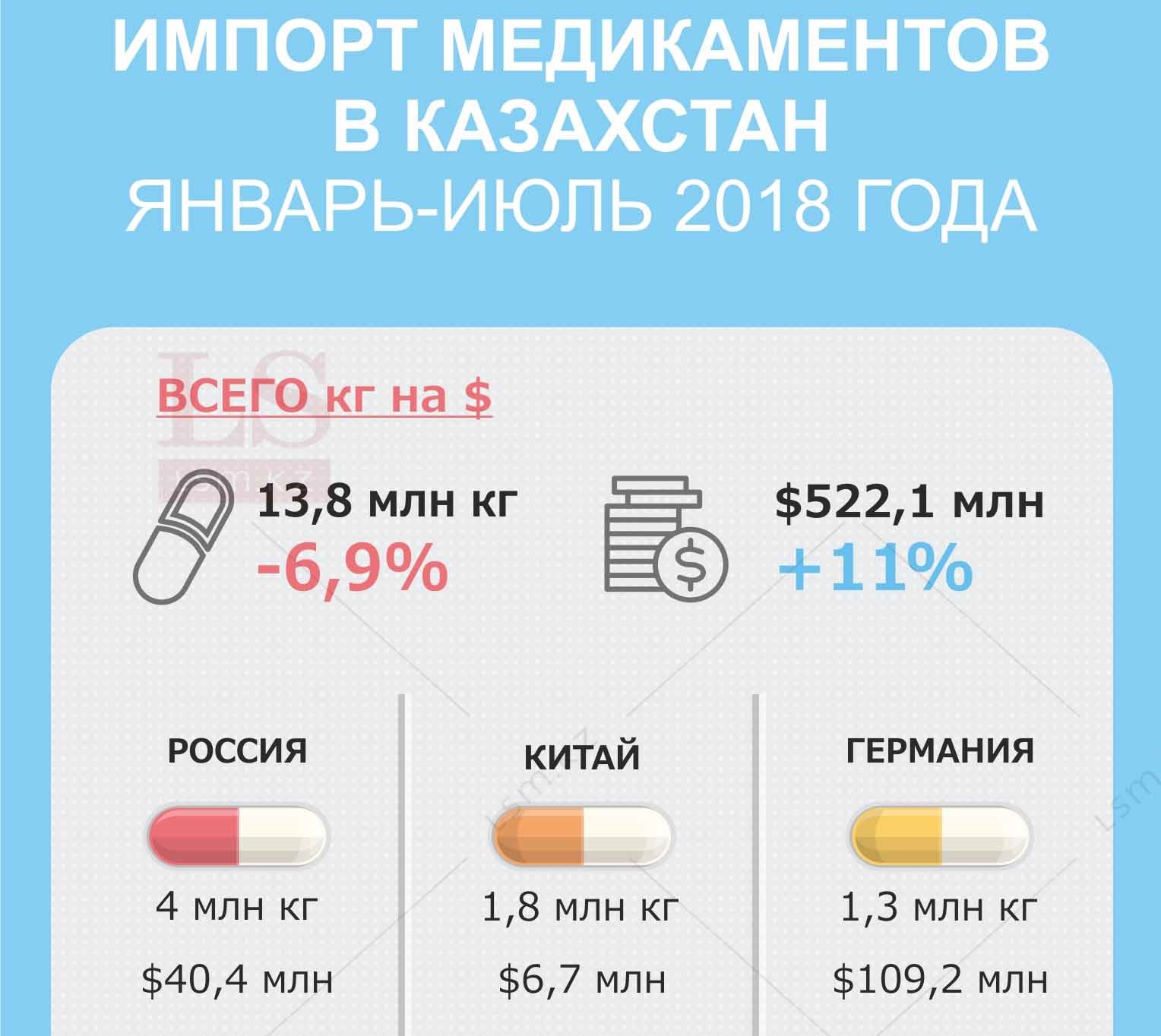 Импорт медикаментов в Казахстане в январе-июле 2018 года составил 13,8 млн кг, передает LS.