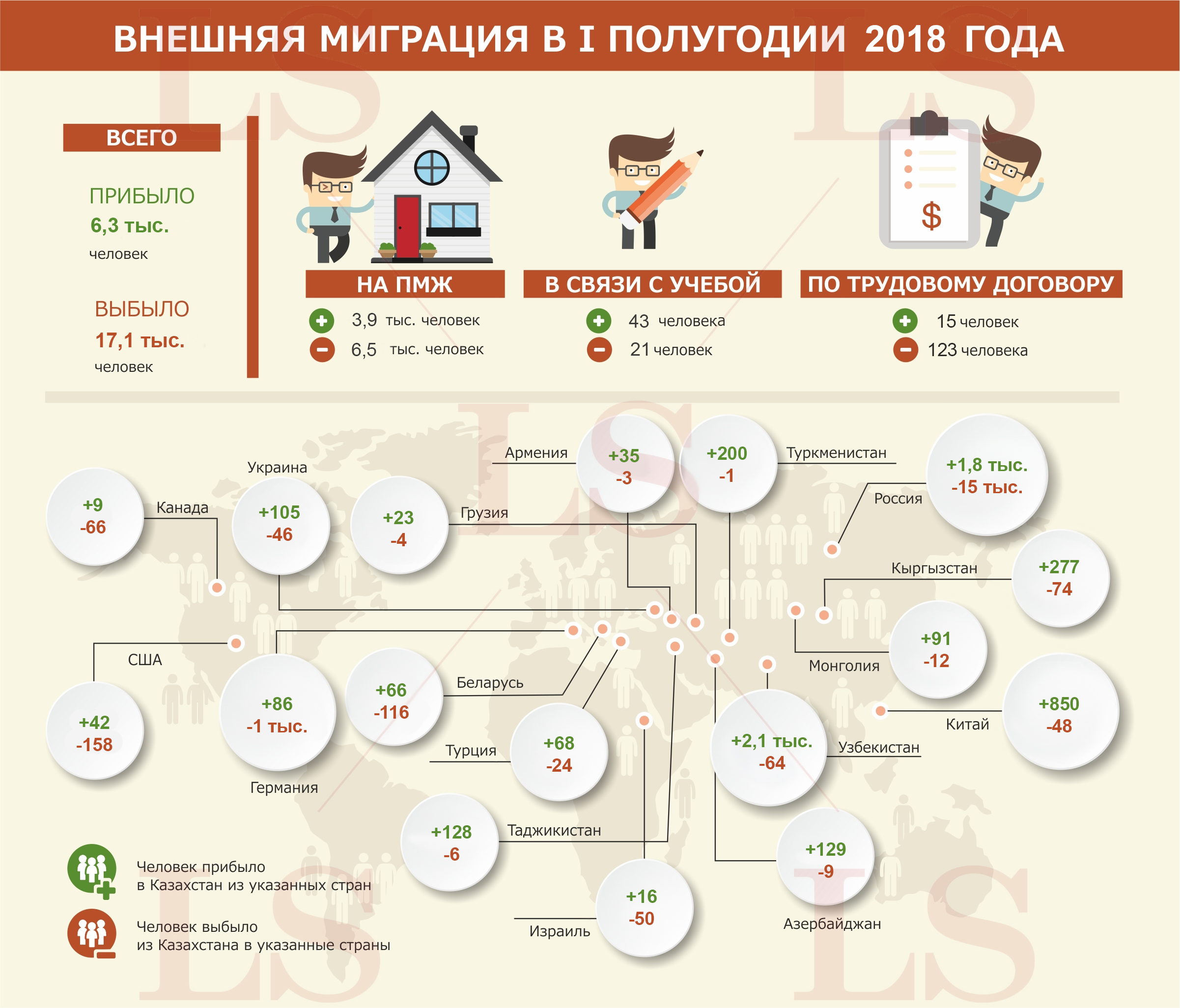 По данным комитета по статистике, в том числе постоянное место жительства (ПМЖ) сменили 6,5 тыс. человек, по трудовому договору уехали 123 человека, а в связи с учебой – 21 человек.