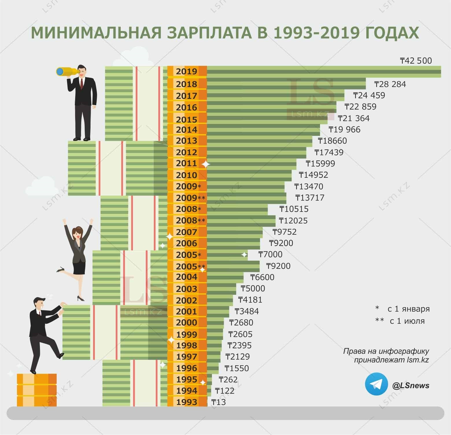 В 2015 году минимальная зарплата превысила отметку в 20 тыс. тенге, а в 2019 году достигла 42500 тенге.