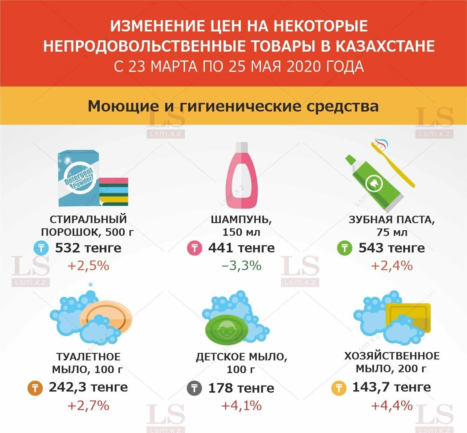 В Казахстане во время карантина подорожали моющие и гигиенические средства, бытовые приборы и медицинские препараты. LS представляет инфографику о том, как выросли в цене некоторые виды непродовольственных товаров.
