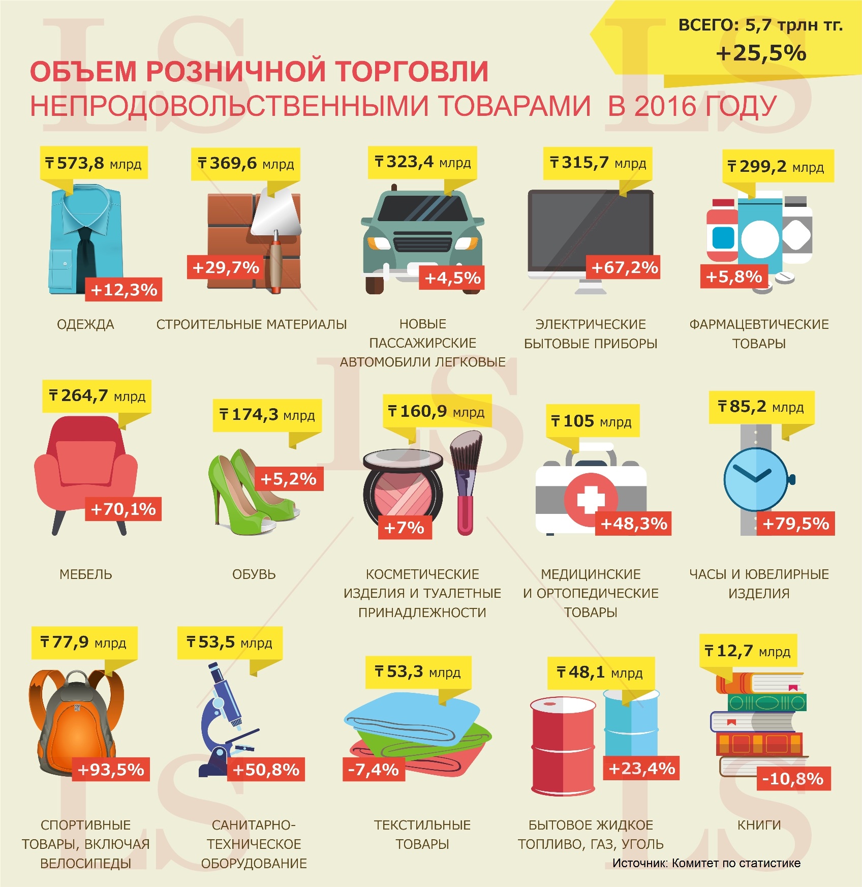 Объем розничной торговли непродовольственными товарами в 2016 году составил 5,7 трлн тенге, передает LS.