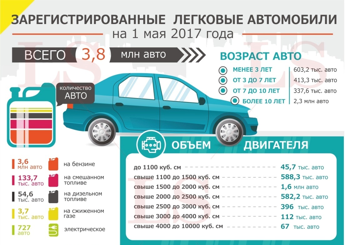По объему двигателя наиболее популярная кубатура у казахстанцев - свыше 1,5 тыс. до 2 тыс. куб. см. Автомобилей с такой мощностью состоит на учете 1,6 млн. Также много транспортных средств кубатурой от 1,1 тыс. до 1,5 куб. см (588,3 тыс.) и от 2 тыс. до 2,5 тыс. куб. см (582,2 тыс. авто).