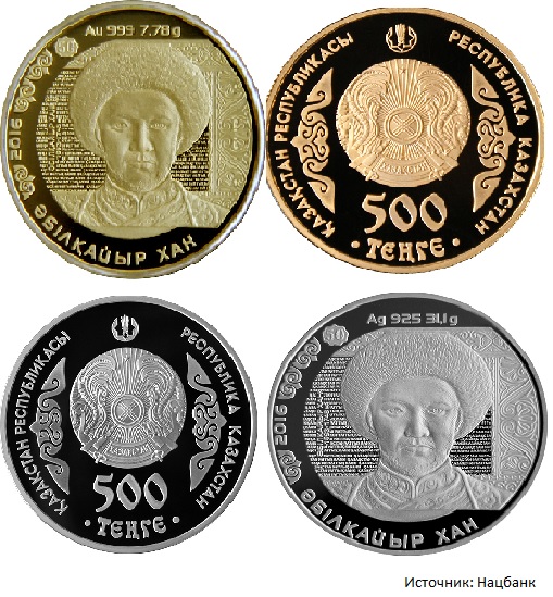 Они сделаны из золота и серебра proof-качества номиналом 500 тенге и из сплава нейзильбер номиналом 100 тенге.