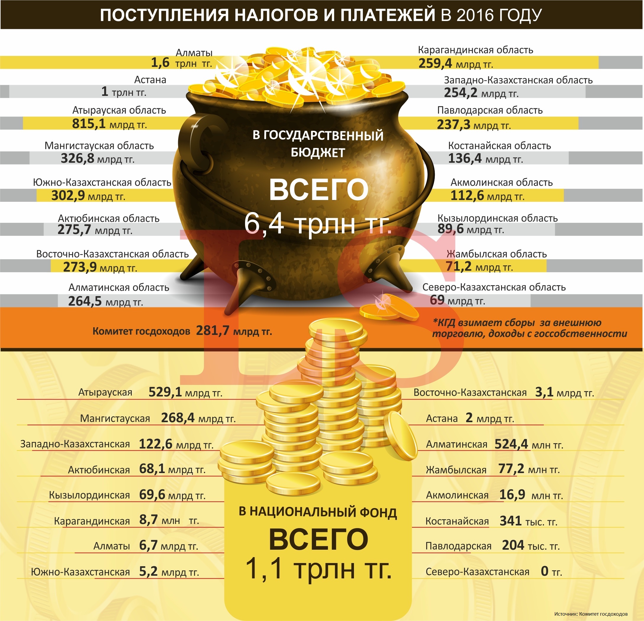 В то время как Кызылординская область принесла в госбюджет 89,6 млрд тенге, а Жамбылская область – 71,2 млрд тенге, Северо-Казахстанская область - 69 млрд тенге. К тому же, комитетом государственных доходов было собрано за внешнюю торговлю и оборот с госсобственности на 281,7 млрд тенге.