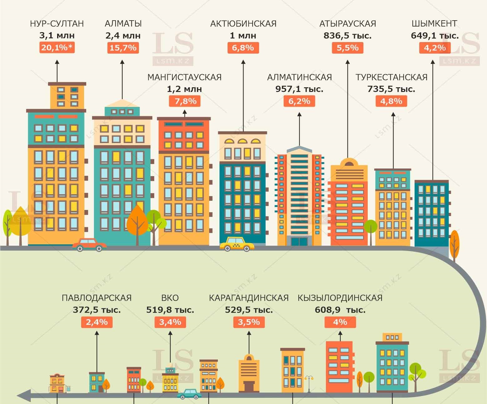 Наибольший объем жилья был введен в эксплуатацию в Нур-Султане (20,1% от общего объема) и в Алматы (15,7%).