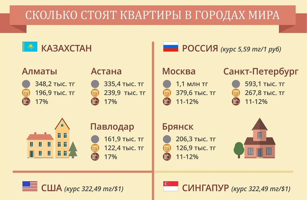 Также квартиры в двух мегаполисах Казахстана стоят в девять раз дешевле, чем в Нью-Йорке. При этом среднемесячная номинальная зарплата в американском городе составляет 1,3 млн тенге против 196,9 тыс. тенге в Алматы и 239,9 тыс. тенге в Астане (данные Комитета по статистике за IV квартал 2016 года).