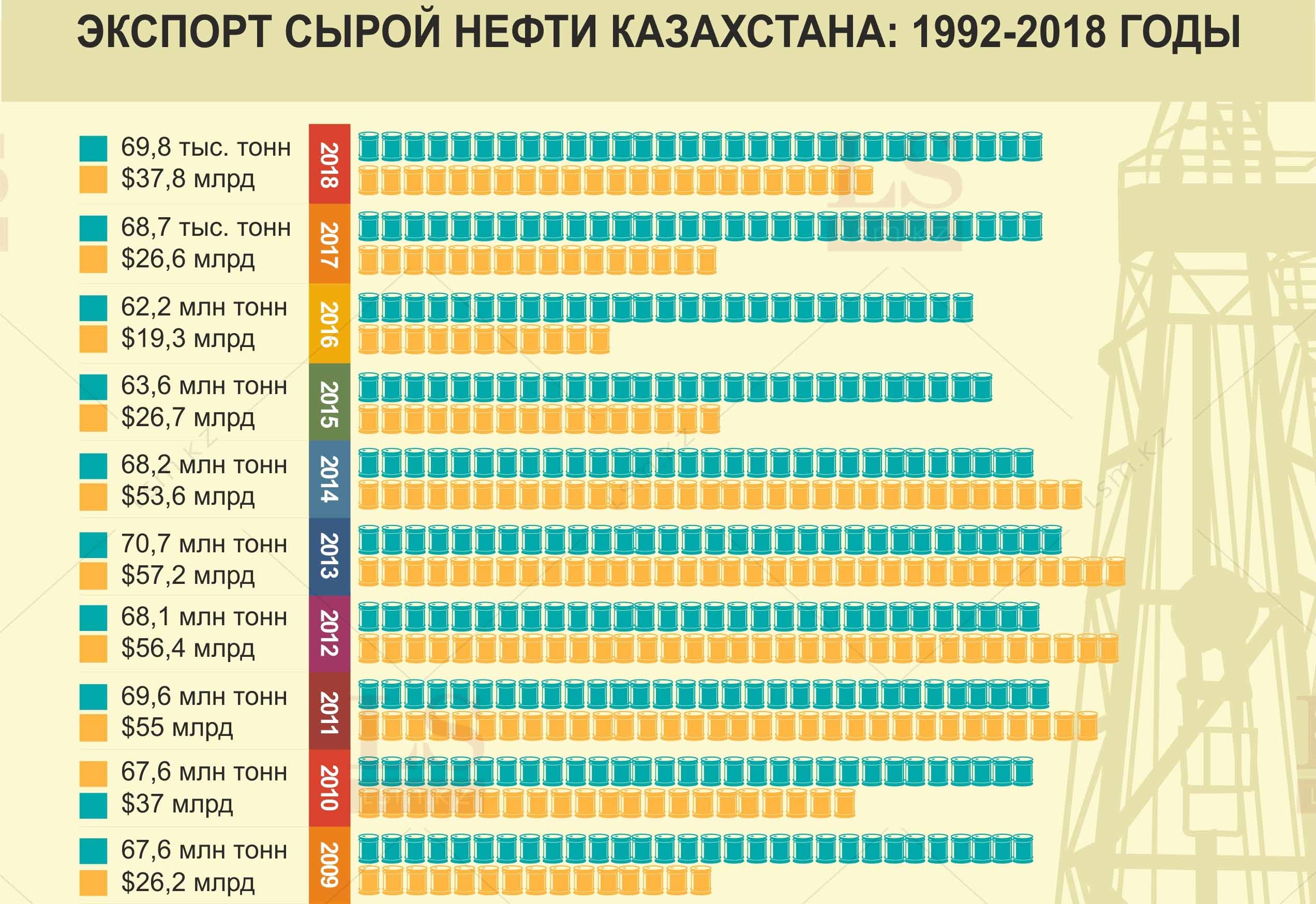 В 2014 году за 68,2 млн тонн страна выручила $53,6 млрд, в 2015-м за 63,6 млн тонн было заработано $26,7 млрд, а экспортированные 62,2 млн тонн принесли казахстанским нефтяным компаниям $19,3 млрд.