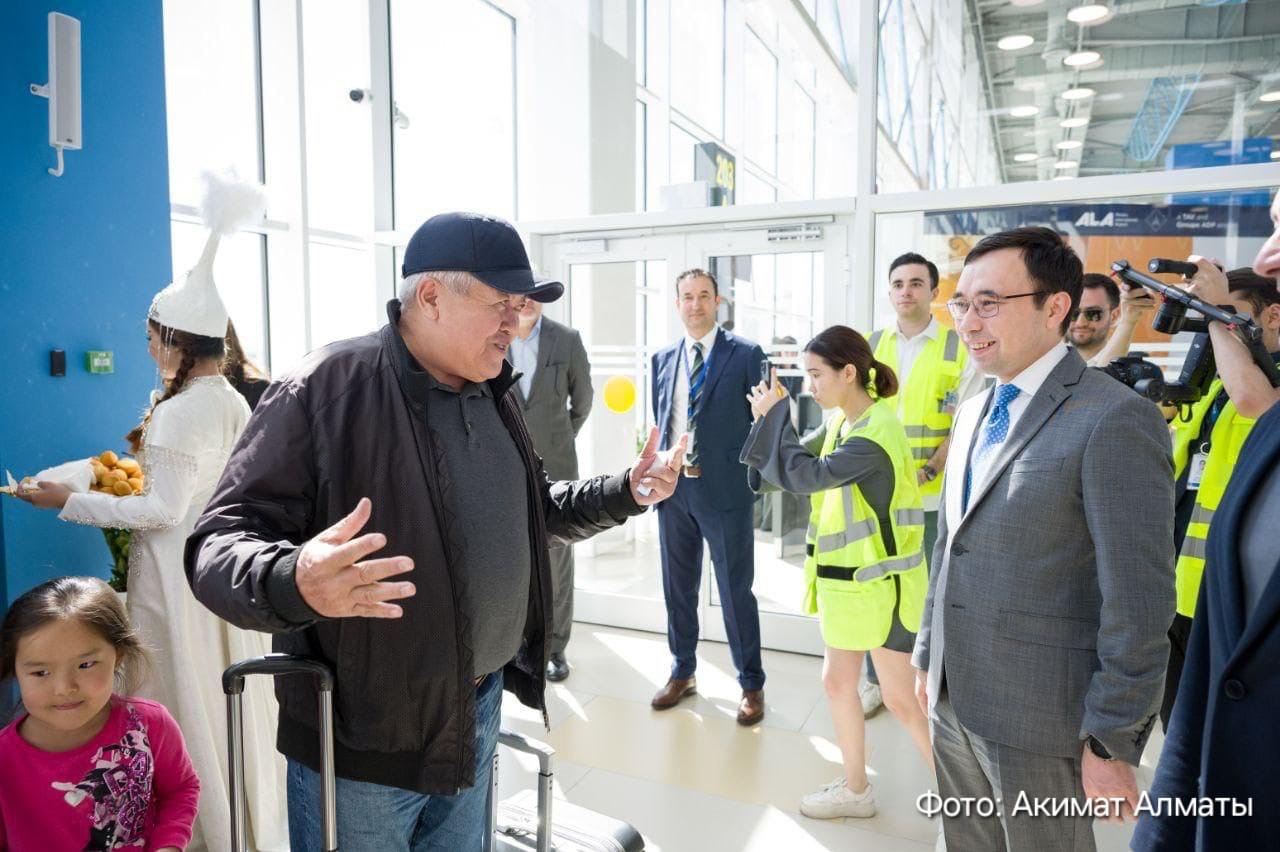 Первых пассжариров встречали руководство международного аэропорта Алматы, акимата города Алматы и компании "Эйр Астана".