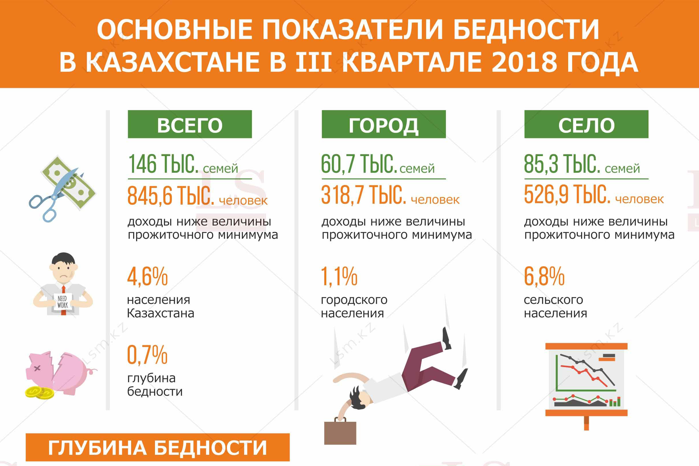 В Казахстане в III квартале 2018 года 146 тыс. семей (845,6 тыс. человек) имели доходы ниже величины прожиточного минимума, передает LS.