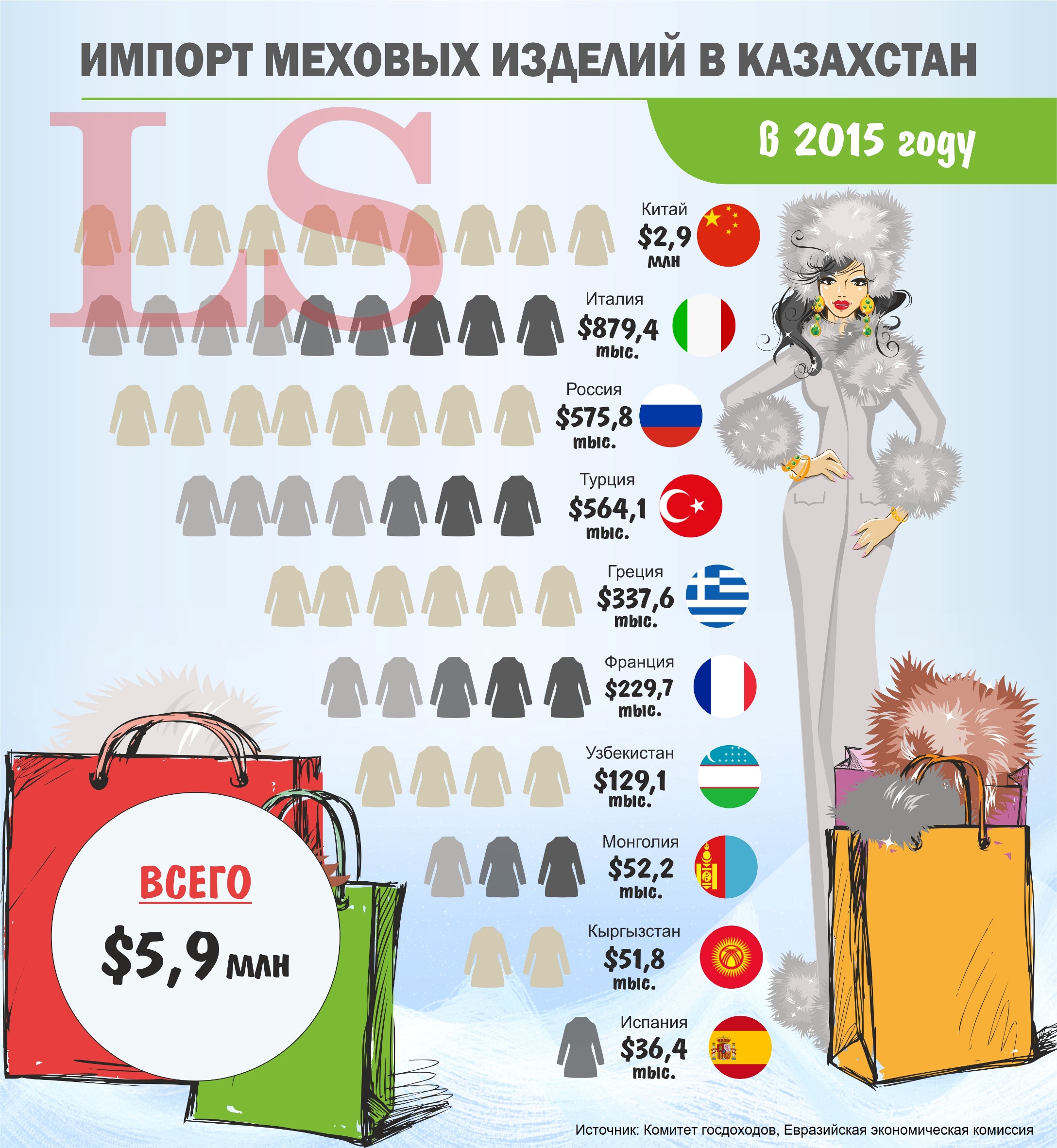 В 2015 году импорт меховых изделий составил $5,9 млн. Главными поставщиками шуб стали Китай, Италия, Россия и Турция. Как сообщили в комитете госдоходов, только из Китая за указанный период было завезено меховых изделий на $2,9 млн. Из Италии немногим меньше - $879,4 тыс. В то время как российских шуб и меха было закуплено Казахстаном на $575,8 тыс.