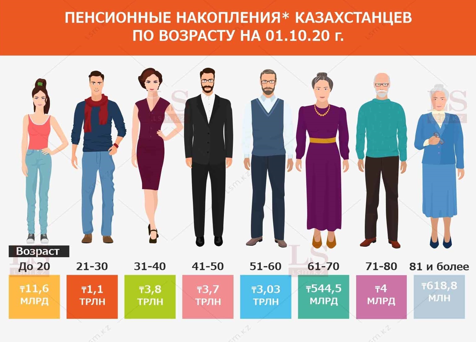 Большая часть пенсионных денег сосредоточена на счетах вкладчиков в возрасте от 31 до 40 лет (почти 3,8 трлн тенге) и от 41 до 50 лет (3,7 трлн тенге). Далее следуют группы от 51 до 60 лет – 3,03 трлн тенге, от 21 до 30 лет – 1,1 трлн тенге и от 61 до 70 лет – 544,5 млрд тенге. Меньше всего денег накоплено на счетах вкладчиков до 20 лет – 11,6 млрд тенге, от 71 до 80 лет – почти 4 млрд тенге и от 81 года и более – 618,8 млн тенге.