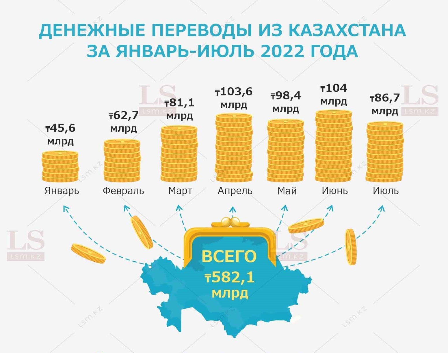 За семь месяцев 2022 года из Казахстана отправили в другие страны более 582 млрд тенге. LS подготовил инфографику о том, куда больше всего денег переводили.