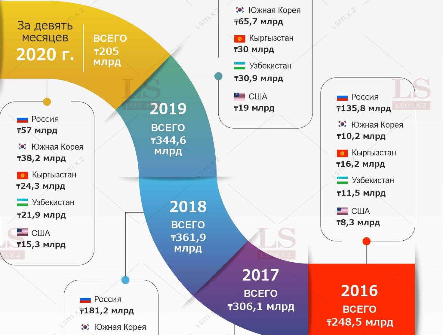 Денежные переводы в Казахстан продолжают сокращаться. LS подготовил инфографику о странах, из которых отправили больше всего денег с 2016 года, и о том, как изменилась ситуация за эти годы.