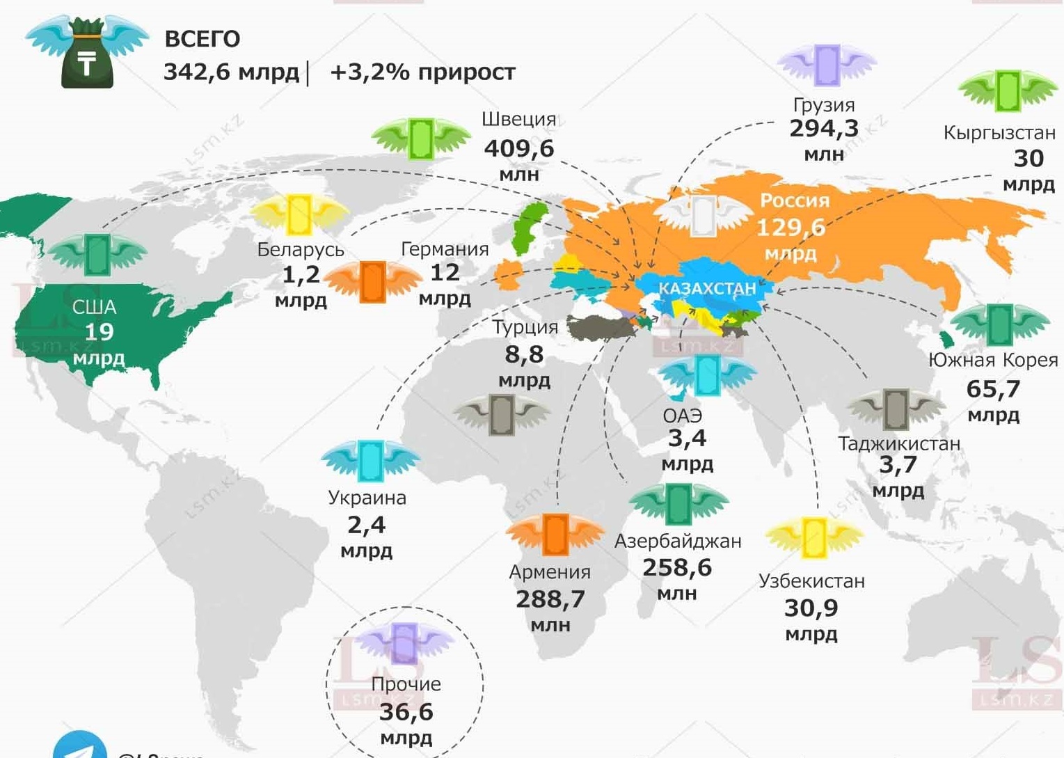 Согласно данным Национального банка, это на 3,2%, или 10,7 млрд тенге, больше, чем в 2018 году. В целом за год в Казахстан отправили свыше 342,6 млрд тенге.