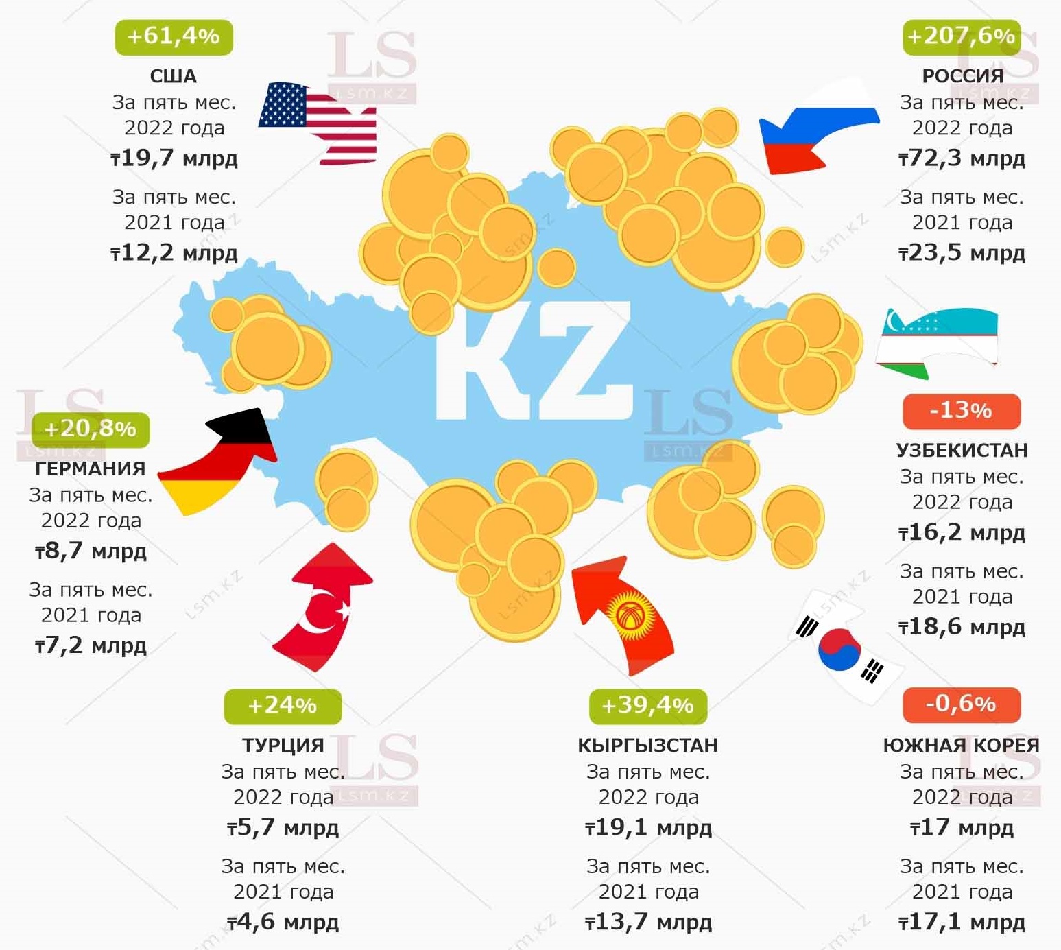 Основная доля средств за пять месяцев 2022 года поступила в Казахстан из России – 72,3 млрд тенге. Это на 207,6% больше, чем за аналогичный период 2021 года.