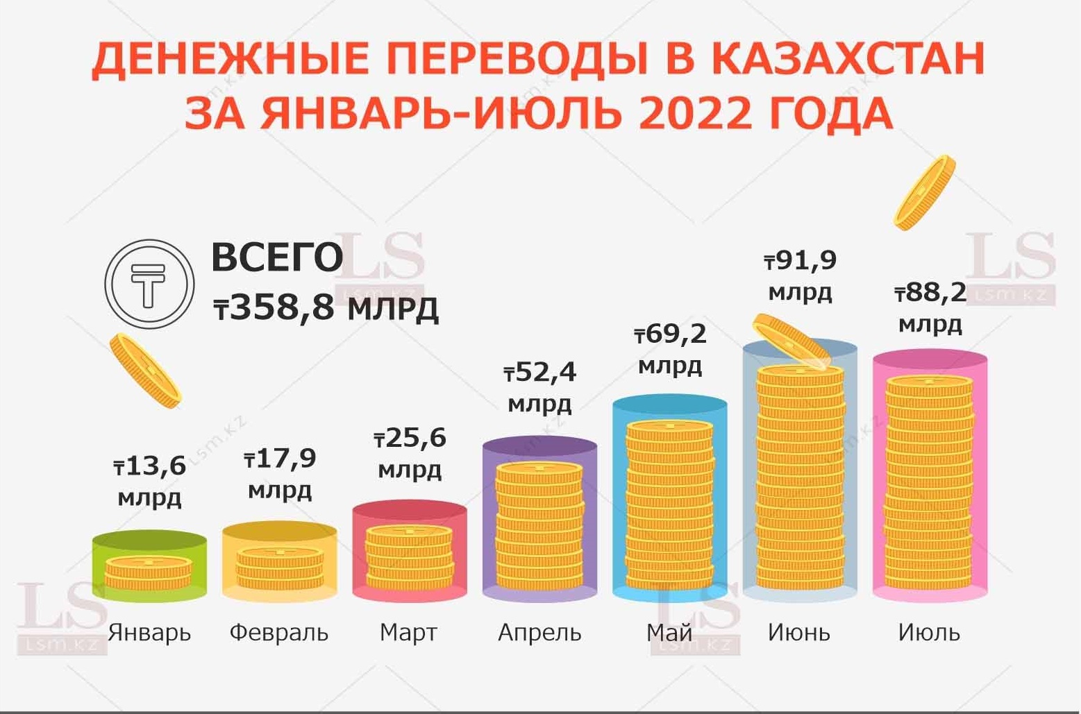 По данным Национального банка, за семь месяцев 2022 года из других стран в Казахстан отправили почти 359 млрд тенге. Больше всего денег поступило в июне – 91,9 млрд тенге, а меньше всего – в январе – 13,6 млрд тенге.