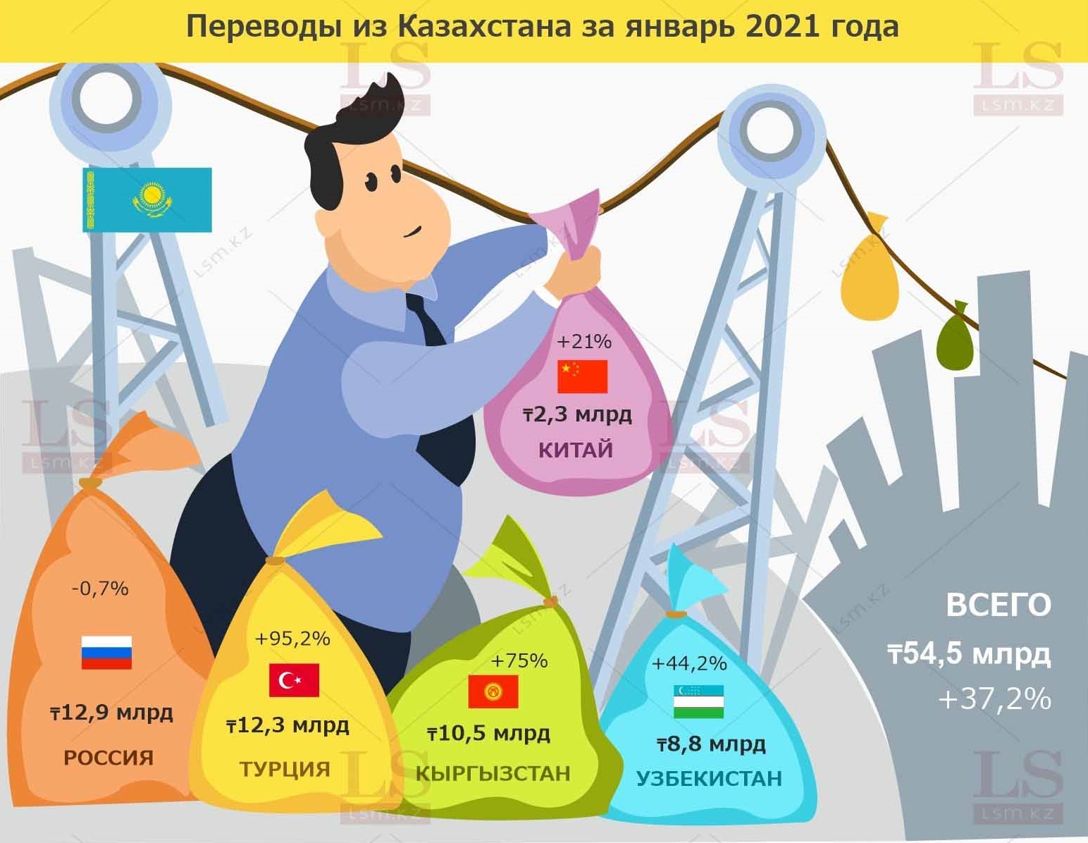 Денежные переводы из Казахстана значительно выросли, а вот в страну, напротив, сократились. LS подготовил инфографику о том, как отправлялись средства в январе 2021 года.
