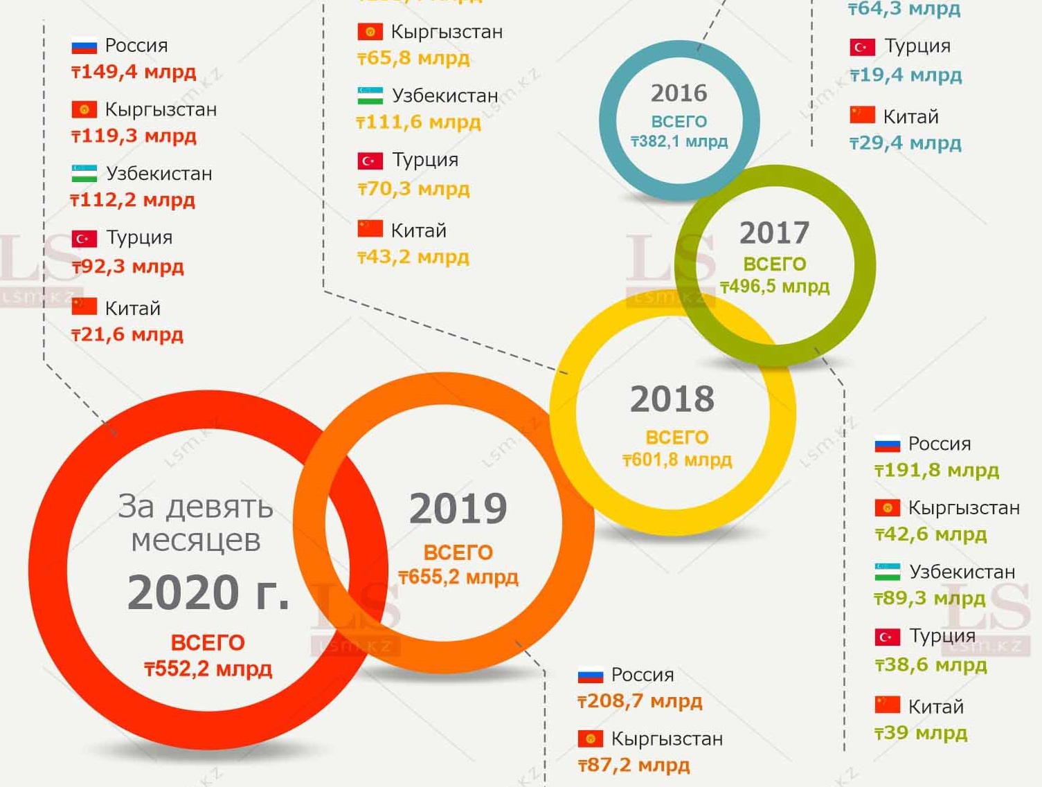 За девять месяцев 2020 года из Казахстана отправили в другие страны более 522 млрд тенге. LS узнал, как менялись денежные переводы с 2016 года.