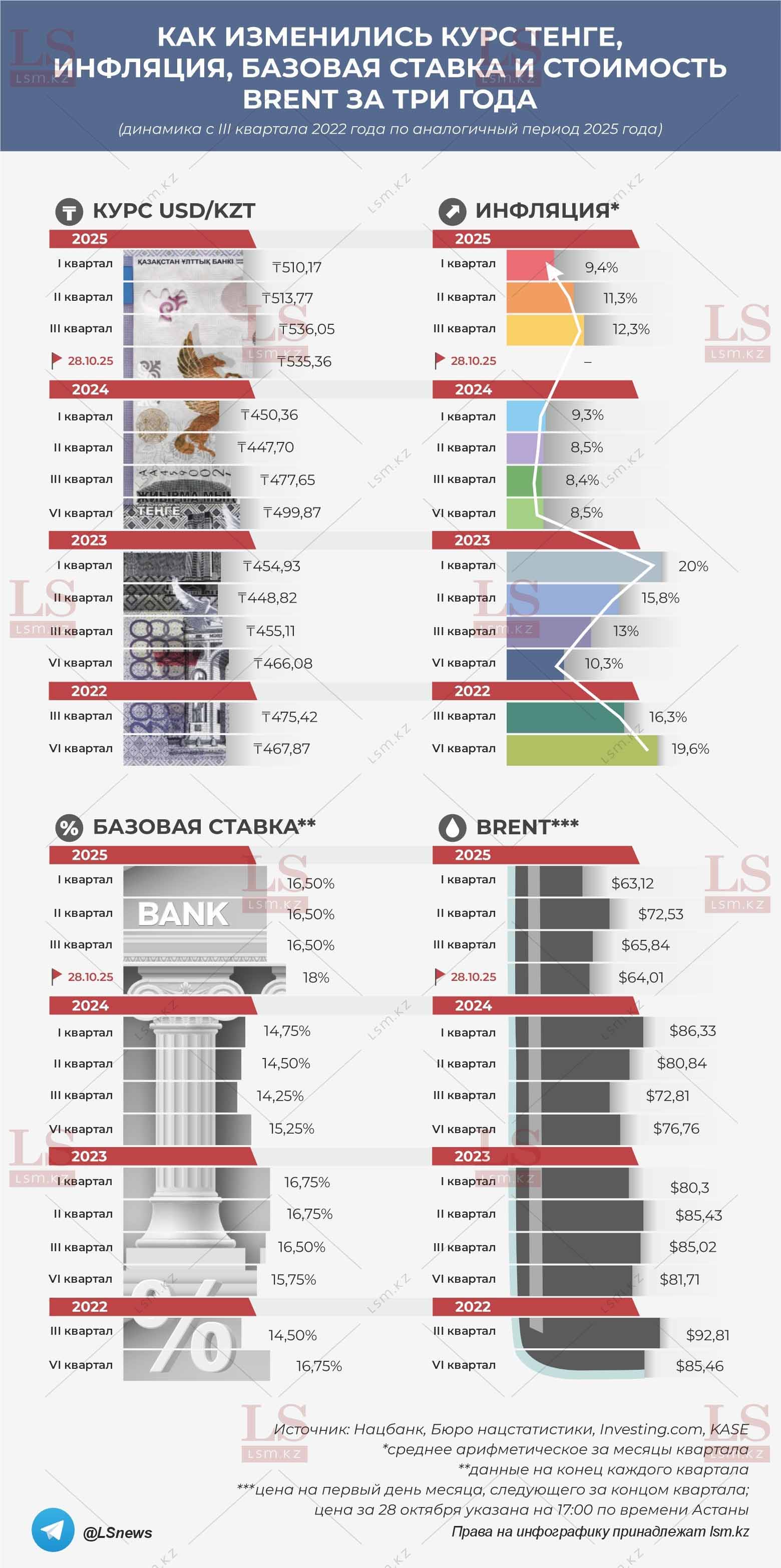 А вот курс тенге к доллару за три года ослаб почти на 12,8%, или на 60,63 тенге. Так, если в III квартале 2022 года его средние значение составляло 475,42 за $1, то за аналогичный период текущего года – уже 536,05. Напомним, что доллар начал торговаться по 500 тенге и выше осенью 2024 года. Тогда профучастники назвали это новой действительностью.