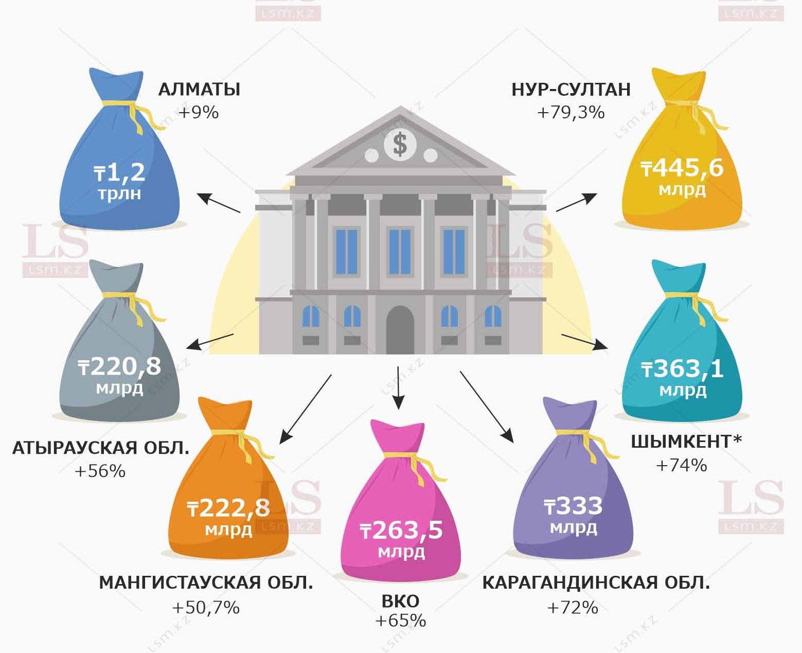 В разрезе регионов традиционно лидером по выдаче займов на личные нужды стал Алматы. В этом городе в банках оформили ссуды на 1,2 трлн тенге (+9%). На второй строчке находится Нур-Султан, где на потребительские цели заняли 445,6 млрд тенге. Третью строчку занимает Шымкент – свыше 363 млрд тенге.
