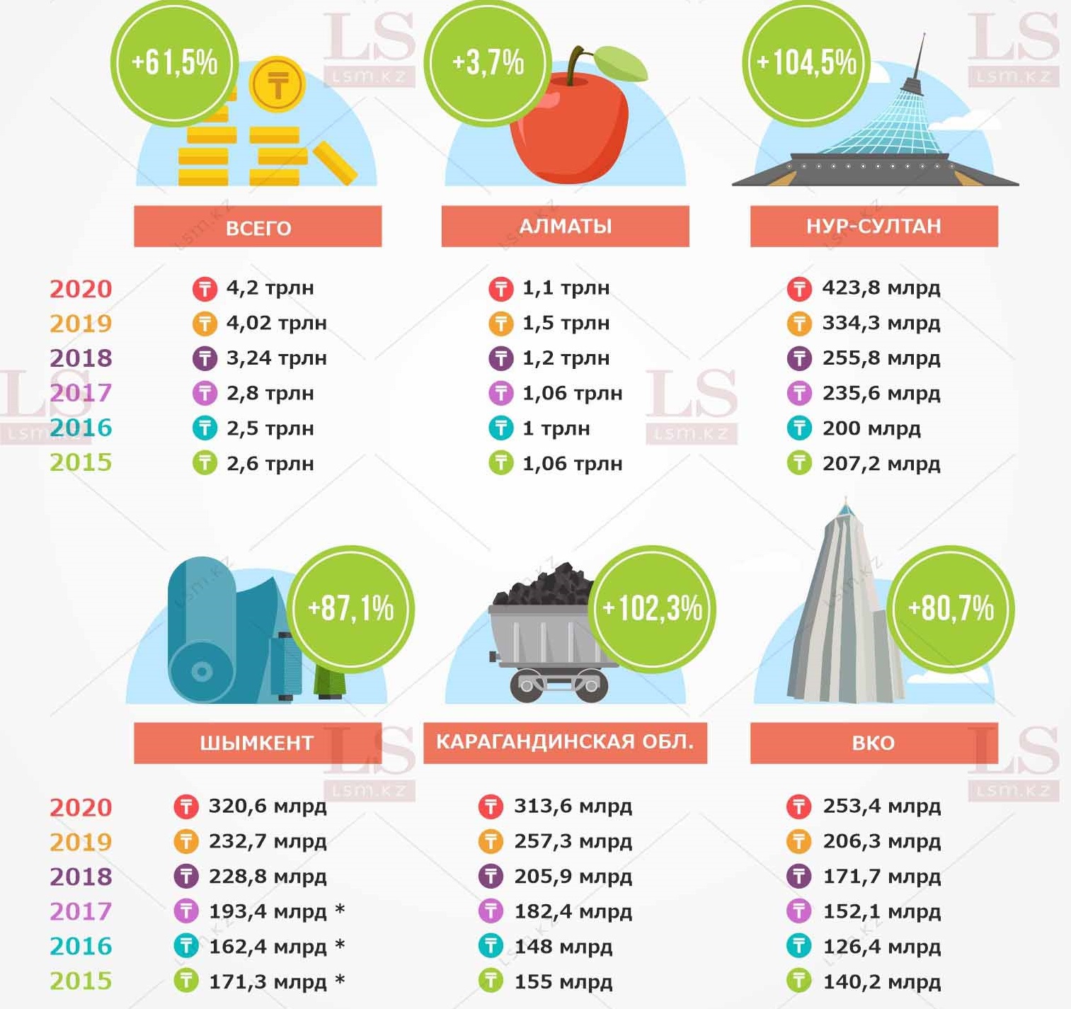 Больше всего ссуд получили алматинцы – на 1,1 трлн тенге в 2020 году с 1,06 трлн тенге в 2015 году (+3,7%).