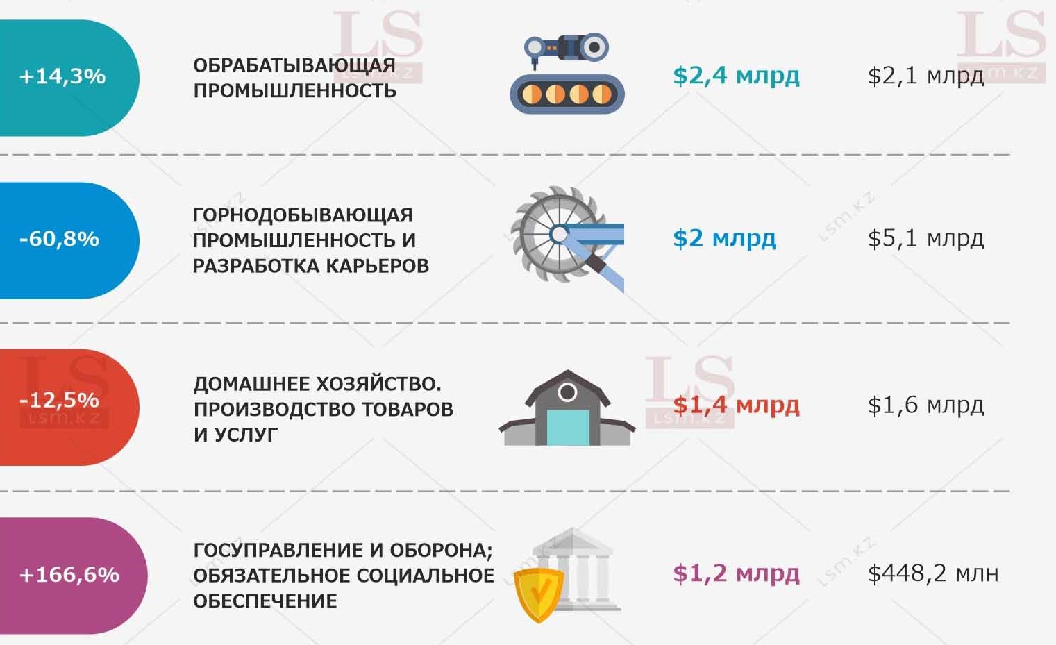 Вместе с тем значительно выросли вложения в госуправление и оборону. За год инвестиции из Казахстана в эту отрасль увеличились на 166%, с $448 млн до $1,2 млрд.