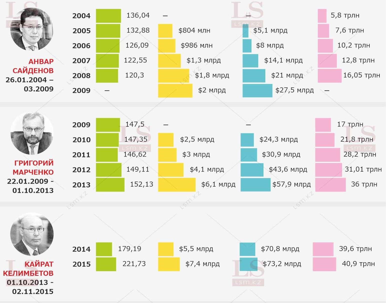 LS подготовил инфографику о том, как менялись экономика и курс тенге при каждом председателе Национального банка за последние 20 лет.