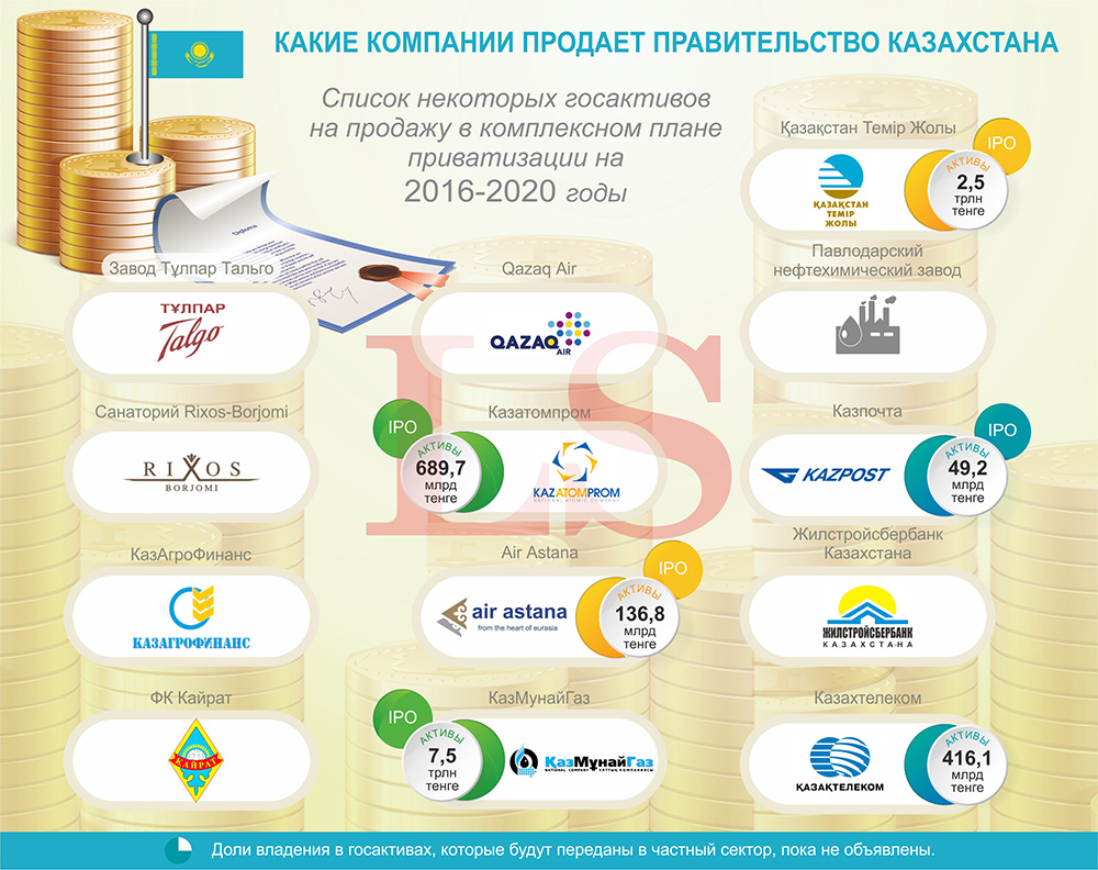 Наиболее интересными по объемам своих активов могут быть такие нацкомпании, как "КазМунайГаз", "Қазақстан темiр жолы", "Казатомпром". Ожидается, что они будут реализованы через IPO. Доли компаний и их стоимость пока не известны. Несмотря на то что комплексный план приватизации правительства рассчитан до 2020 года, нельзя утверждать, что крупнейшие госактивы будут проданы к этому сроку. Это скорее зависит от конъюнктуры сырьевых и других рынков.