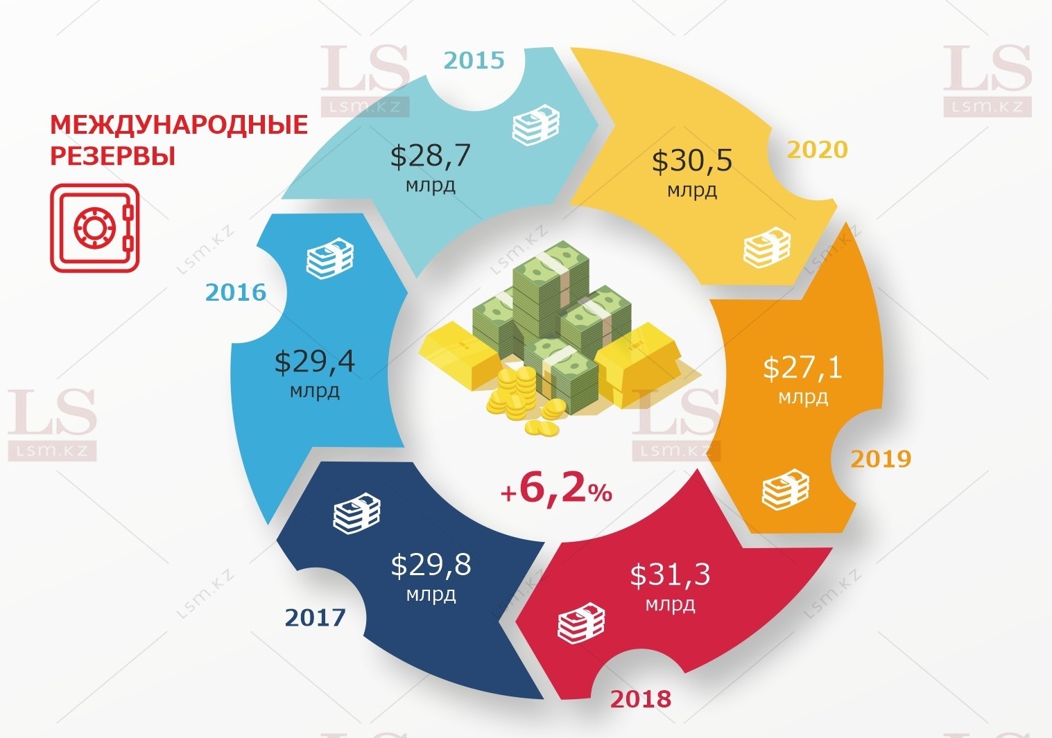 Согласно данным надзорного ведомства, на 1 мая 2020 года международные резервы достигали $30,5 млрд. Тогда как на 1 мая 2015 года – $28,7 млрд. Таким образом, за пять лет они увеличились на 6,2%, или почти на $2 млрд.
