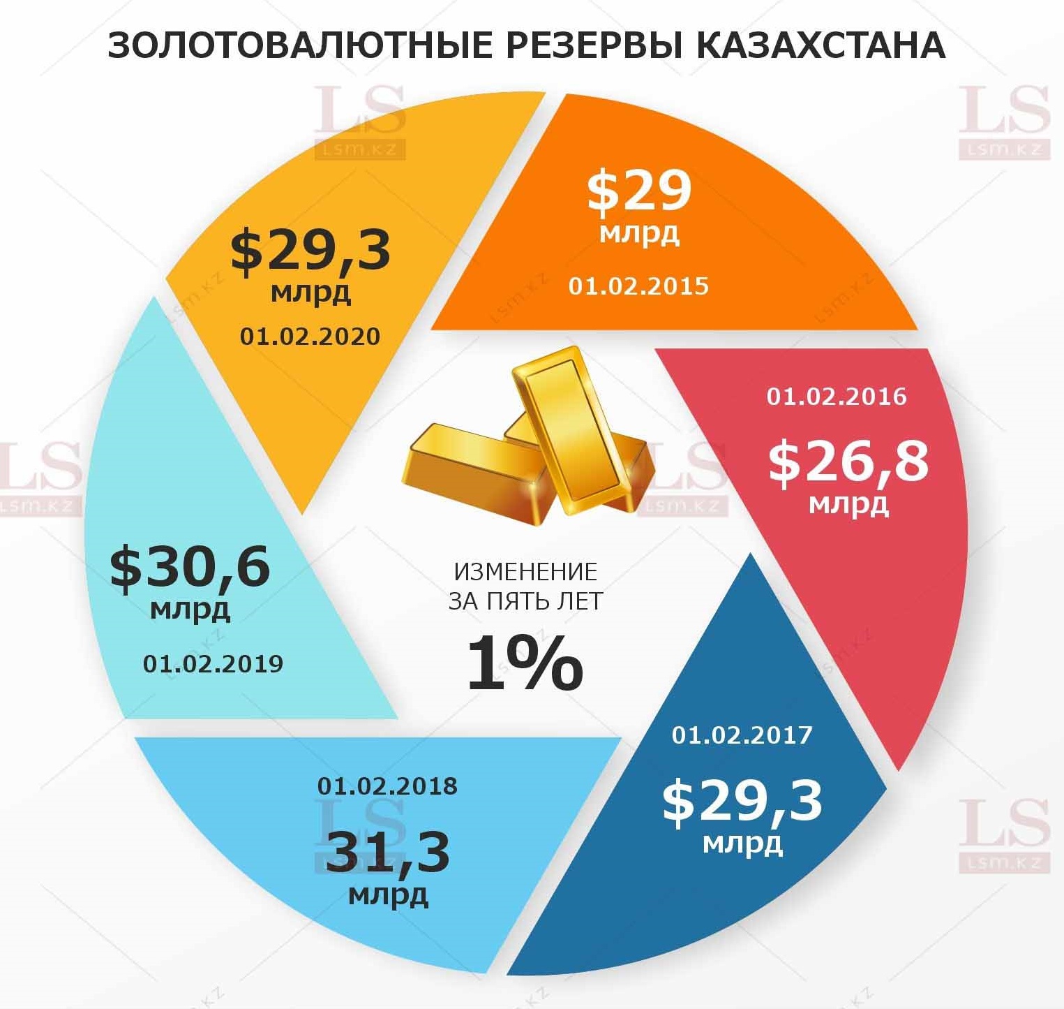 Согласно данным Национального банка, на 1 февраля 2020 года золотовалютные резервы (ЗВР) страны составляли $29,3 млрд. За год произошло снижение на 4,2% с $30,6 млрд. Для сравнения: на 1 февраля 2015 года ЗВР составляли $29 млрд. Таким образом, за пять лет они сократились на 1%.