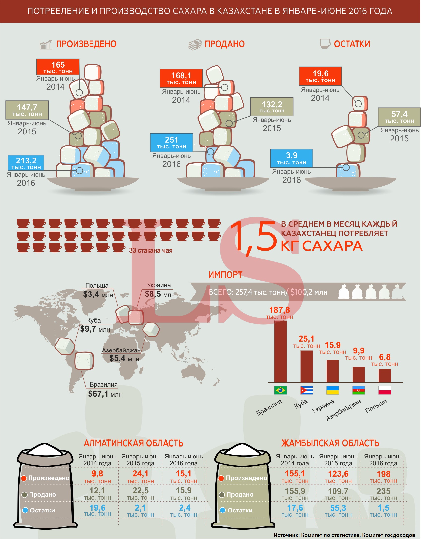 В Казахстане сахарными заводами в январе-июне 2016 года было произведено 213,2 тыс. тонн продукции, а продано 251 тыс. тонн, передает LS.