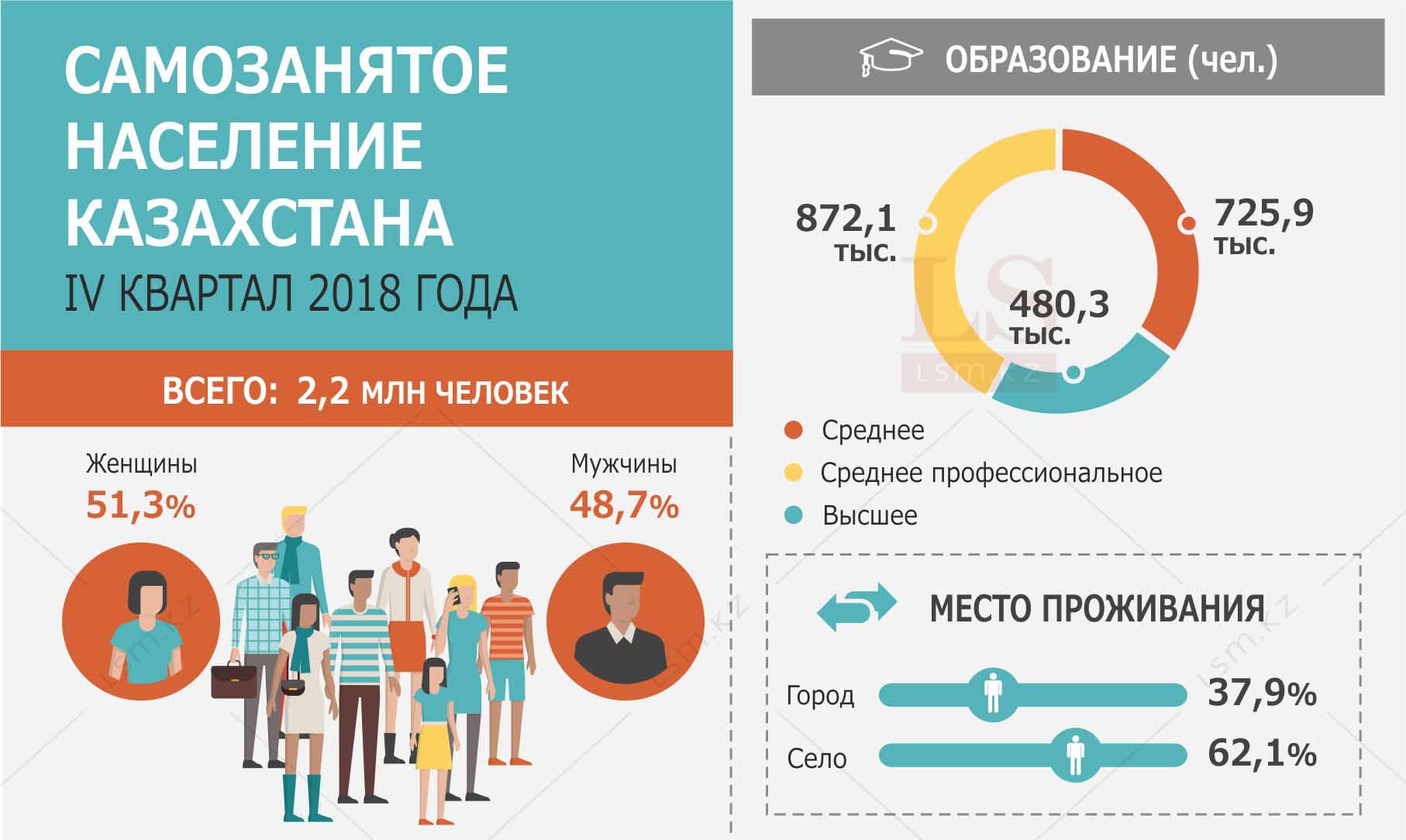 Согласно статистическим данным, большая часть самозанятого населения проживает в селах (62,1%). 16,3% казахстанцев, работающих на себя, проживает в Туркестанской области.