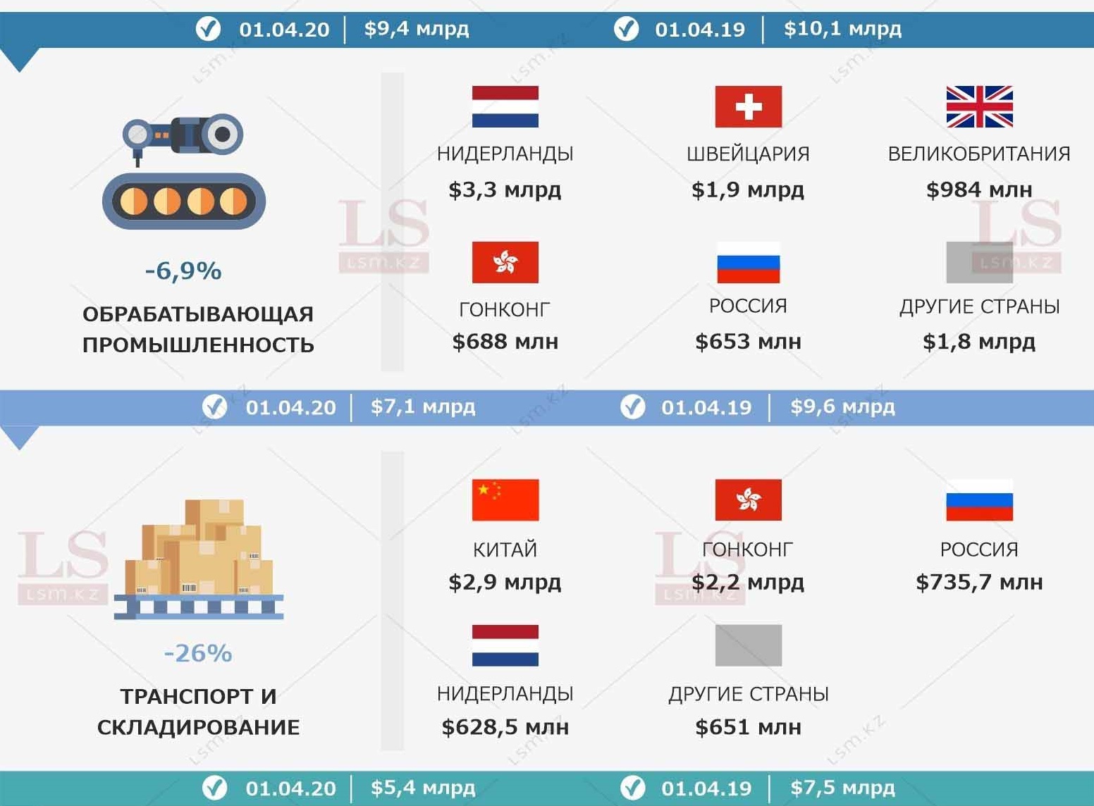 Согласно данным Национального банка, на 1 апреля 2020 года прямые инвестиции из-за границы составили $157,4 млрд. Это на 2,8%, или $4,6 млрд, меньше, чем на аналогичную дату 2019 года.