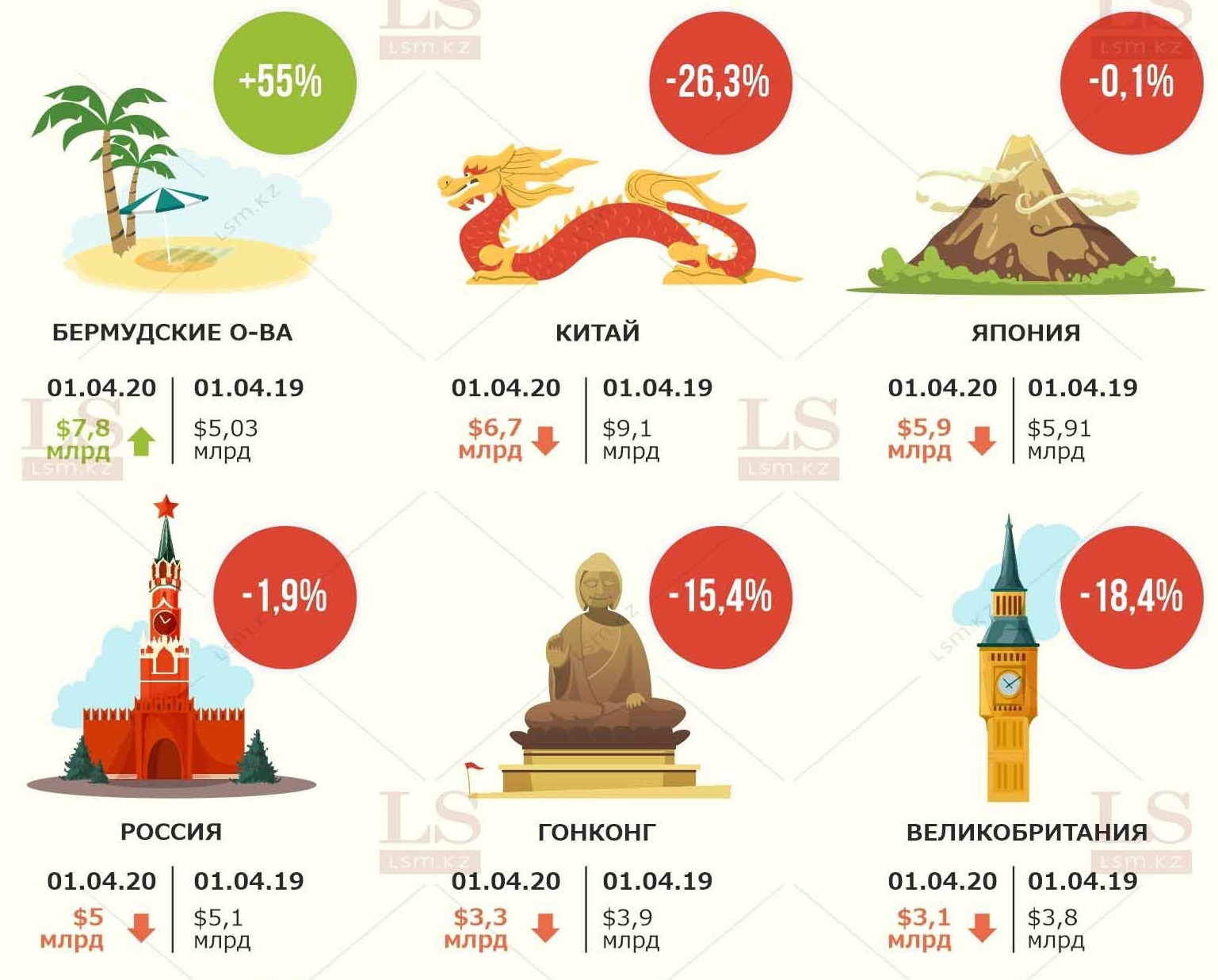 Из-за мирового кризиса инвесторам приходится уменьшать вложения в различные активы и отрасли. LS подготовил инфографику о том, финансирование Казахстана из каких стран за год выросло, а из каких, напротив, заметно сократилось.