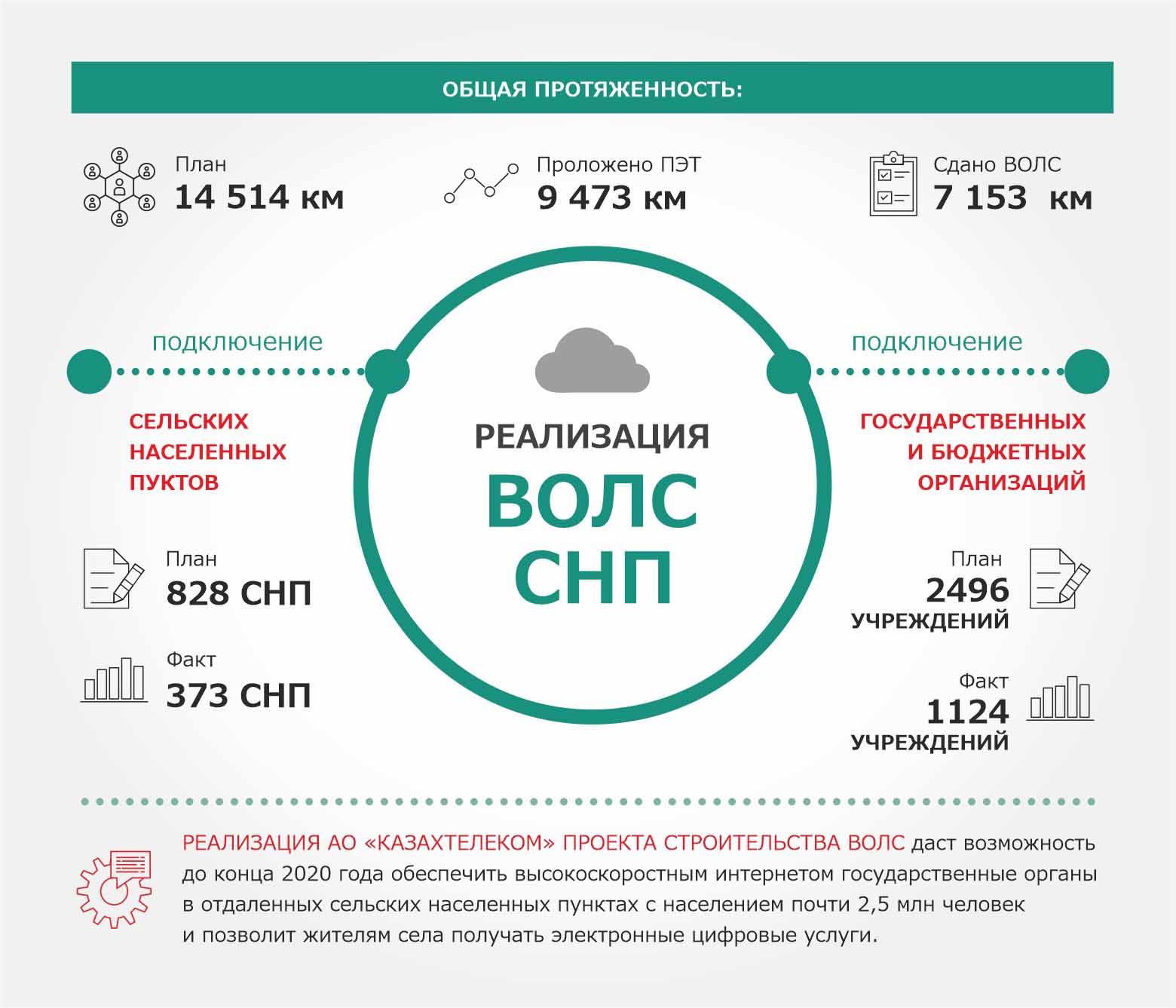 В компании добавили, что проект строительства ВОЛС к сельским населенным пунктам страны должен кардинально решить проблему "цифрового неравенства" между городом и селом. Технические характеристики проекта предполагают прокладку 14,5 тыс. км ВОЛС, которые будут заведены в 828 сельских населенных пунктов по всей стране. Это даст возможность подключить к широкополосному интернету и средствам передачи данных 2 496 государственных учреждений и бюджетных организаций (школы, больницы, акиматы, интернаты, объекты национальной обороны, полиции, аварийных служб и другие). На текущий момент степень реализации проекта достигла отметки около 50%.