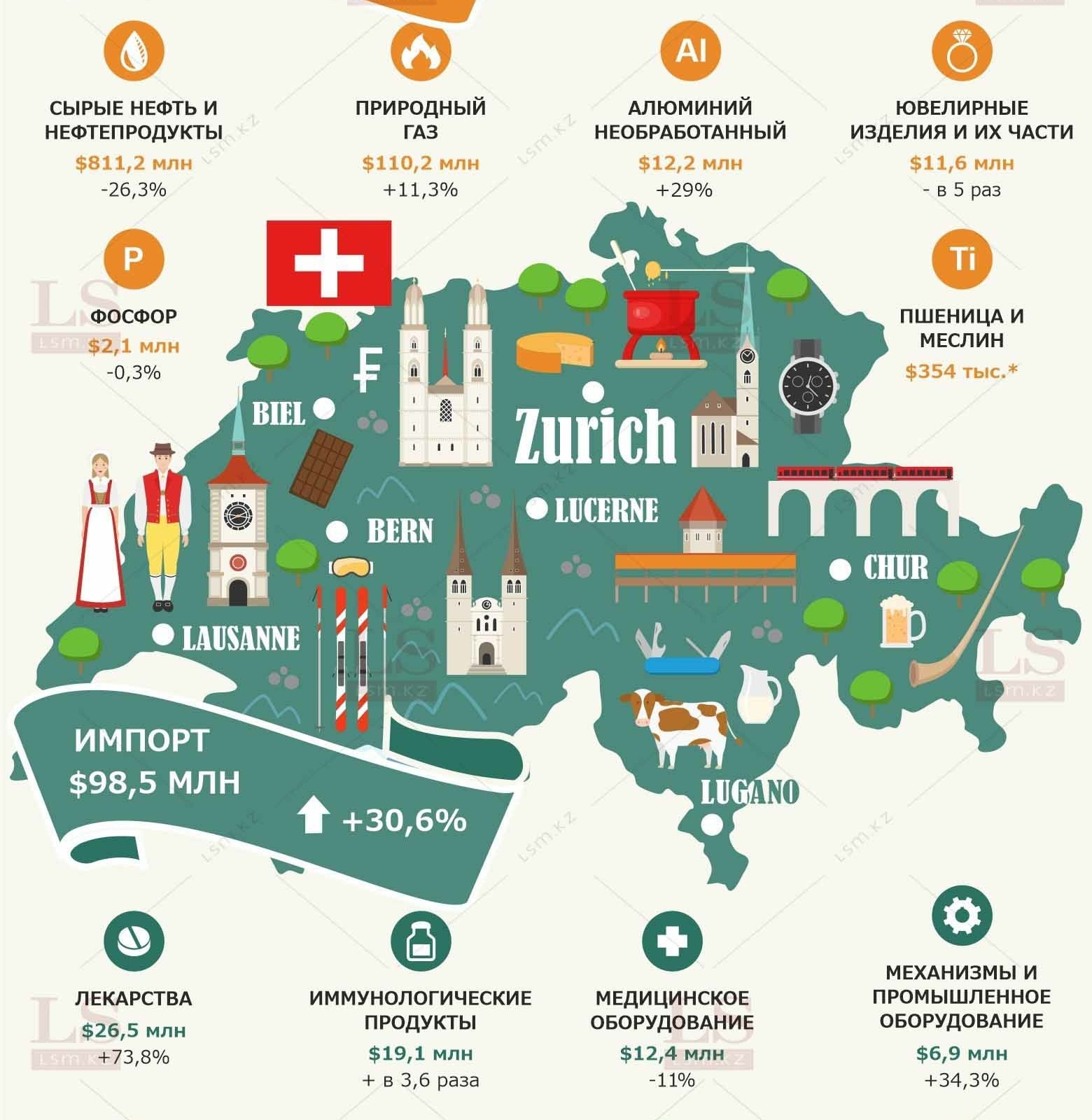 В инфографике представлена более подробная информация о товарообороте между Казахстаном и Швейцарией.