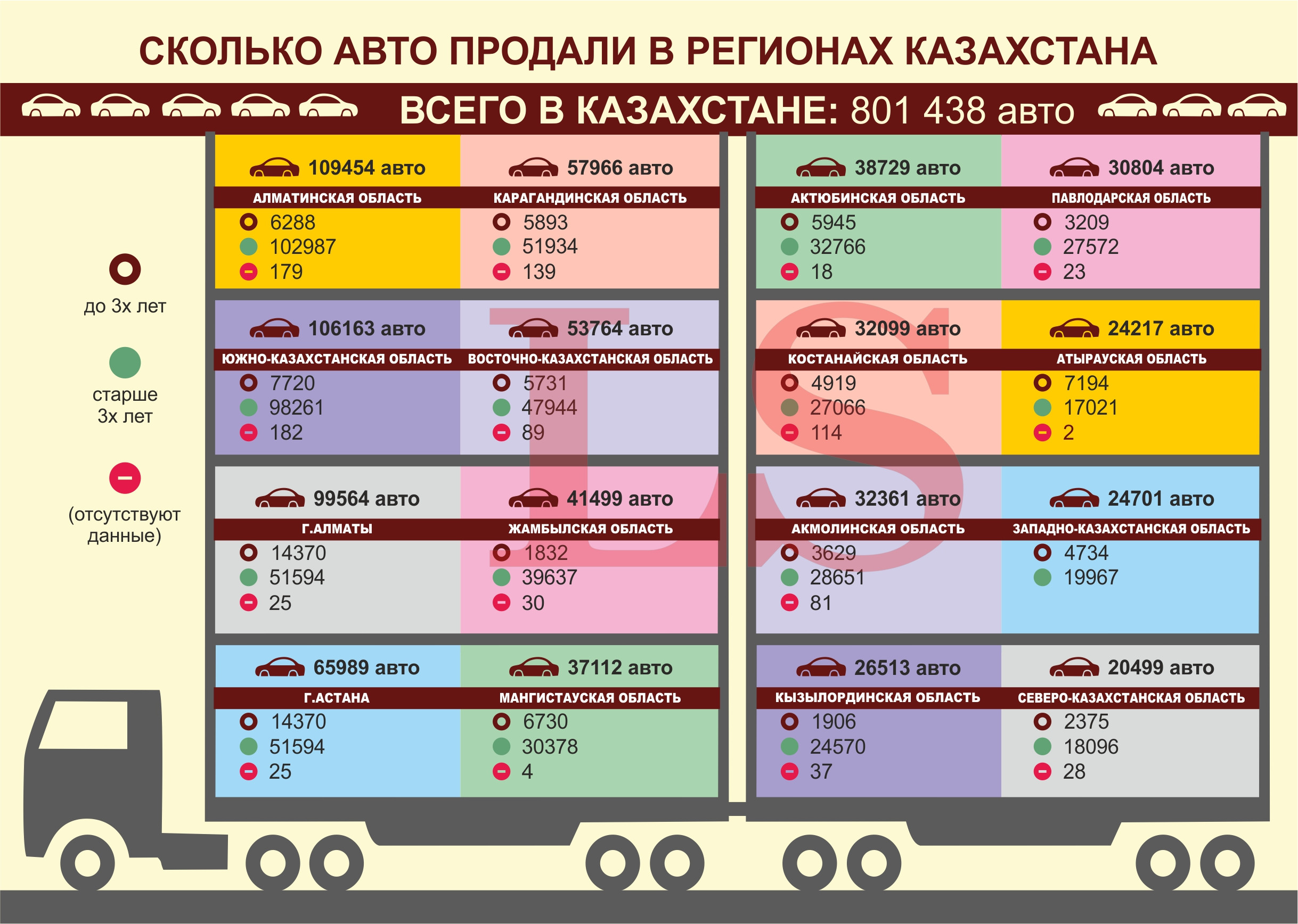 По данным Ассоциации казахстанского автобизнеса, лидирует по количеству продаж авто Алматинская область. Всего в этом регионе было куплено 109 тыс. машин за 11 месяцев 2016 года. При этом машины меньше трех лет составляют всего 6 тыс. единиц. На втором месте Южно-Казахстанская область – 106 тыс. авто. Также в пятерку входят Алматы (99 тыс. авто), Астана (66 тыс. авто) и Карагандинская область (58 тыс. авто). Замыкают рейтинг Западно-Казахстанская область (24,7), Атырауская область (24,2 тыс. авто) и Северо-Казахстанская область, где было совершено всего 20 тыс. сделок.