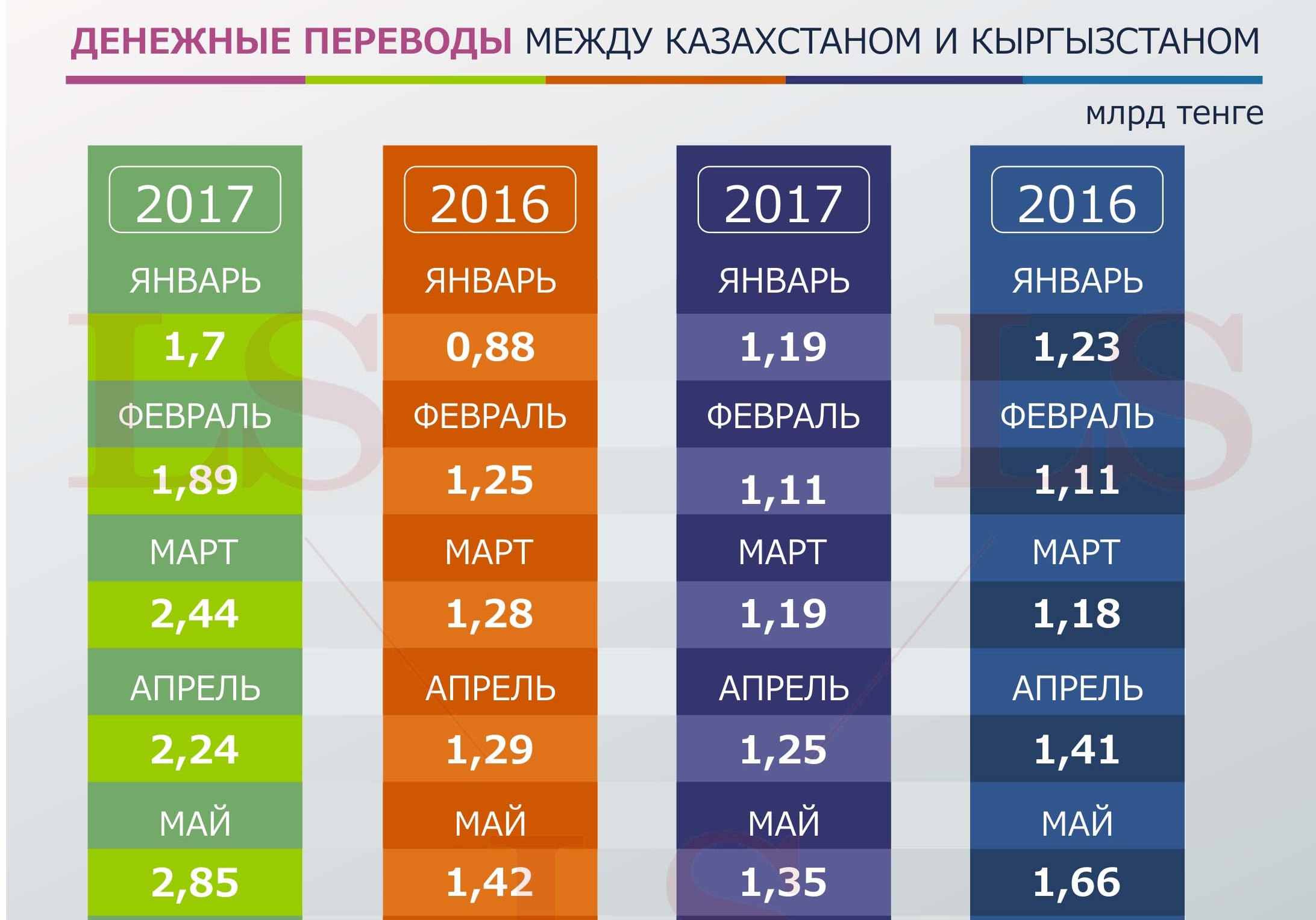 В то же время поток средств из Кыргызстана в Казахстан значительно ниже. Так, с начала 2017 года в республику перевели 13,3 млрд тенге (31 тыс. транзакций). Показатель в аналогичном периоде 2016 года также не изменился и составил 12 млрд тенге (28,3 тыс. транзакций).