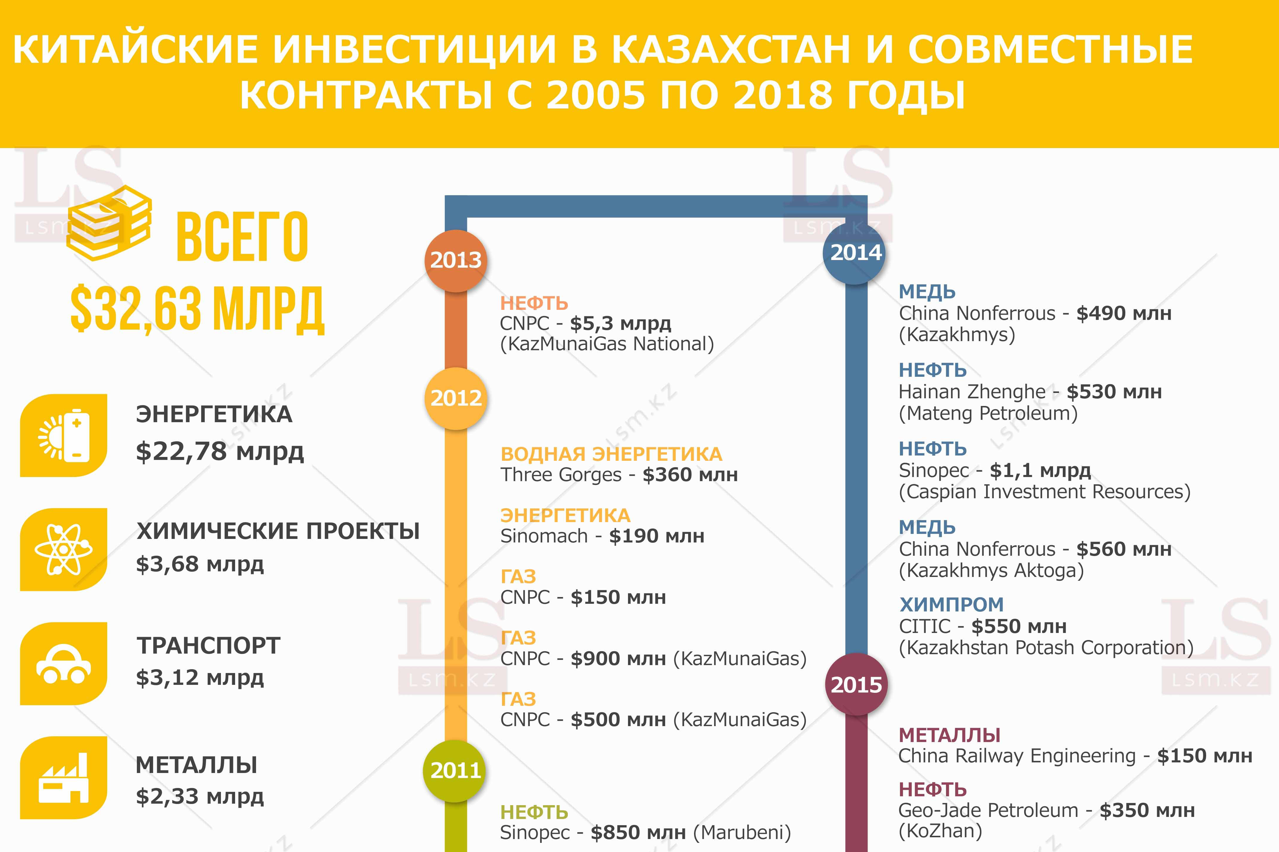 С 2005 по 2018 годы инвестиции Китая в казахстанские компании и сумма совместных проектов превысили $32,63 млрд, передает LS.