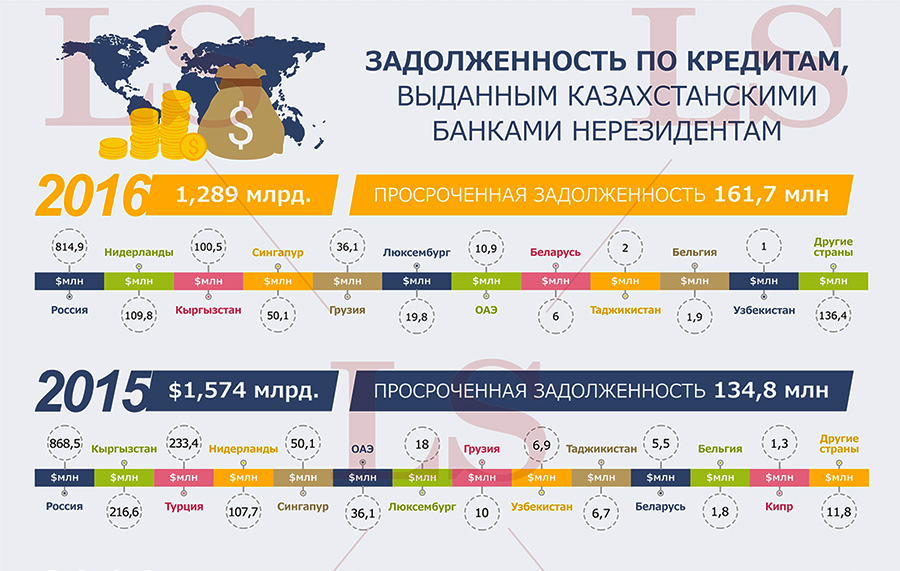 Согласно последним данным Национального банка, задолженность по кредитам, выданным казахстанскими банками иностранцам, на 1 января 2017 года составила $1,289 млрд. Из этой суммы на просроченные займы приходится $161,7 млн.