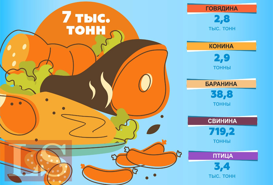Самые крупные поставки мяса пришлись на птицу (3,4 тыс. тонн) и говядину (2,8 тыс. тонн). Свинины было экспортировано 719,2 тонны, баранины - 38,8 тонны, а конины – 2,9 тонны.