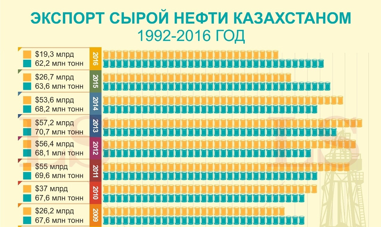 В 2014 году за 68,2 млн тонн страна выручила $53,6 млрд, в 2015 за 63,6 млн тонн было заработано $26,7 млрд, а экспортированные 62,2 млн тонн принесли казахстанским нефтяным компаниям $19,3 млрд.